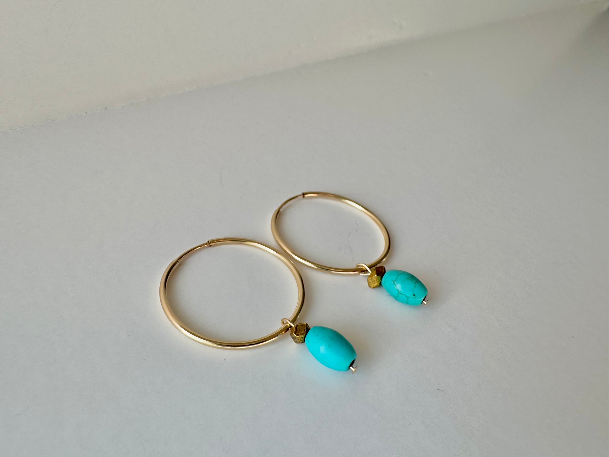 These thin eternity hoop earrings are high quality and comfortable. Each gold-filled hoop is strung with a faux turquoise gemstone bead pendant on a gold filled headpin. The combination of these materials and the simple design make these the perfect lightweight, yet bold accessory for every day wear.