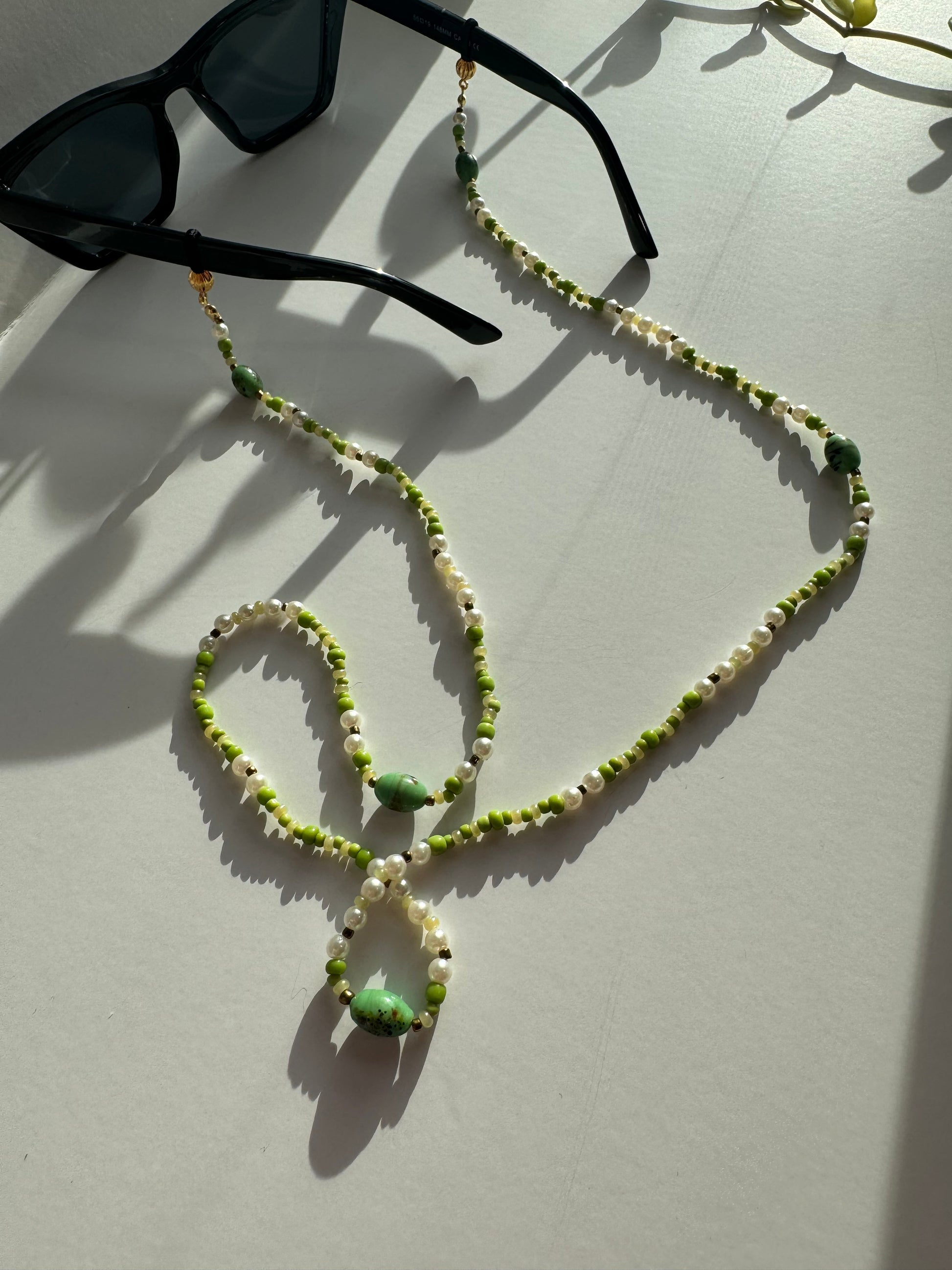 Designed and created by hand from beads and materials sourced from reclaimed jewelry, each Sunglasses Chain is a one-of-a-kind work of art (just like you) and it’s stretchy grip holders fit most sizes of glasses arms, so it can be worn on any type and style of glasses (sunglasses, prescription glasses, blue light blockers, etc.).