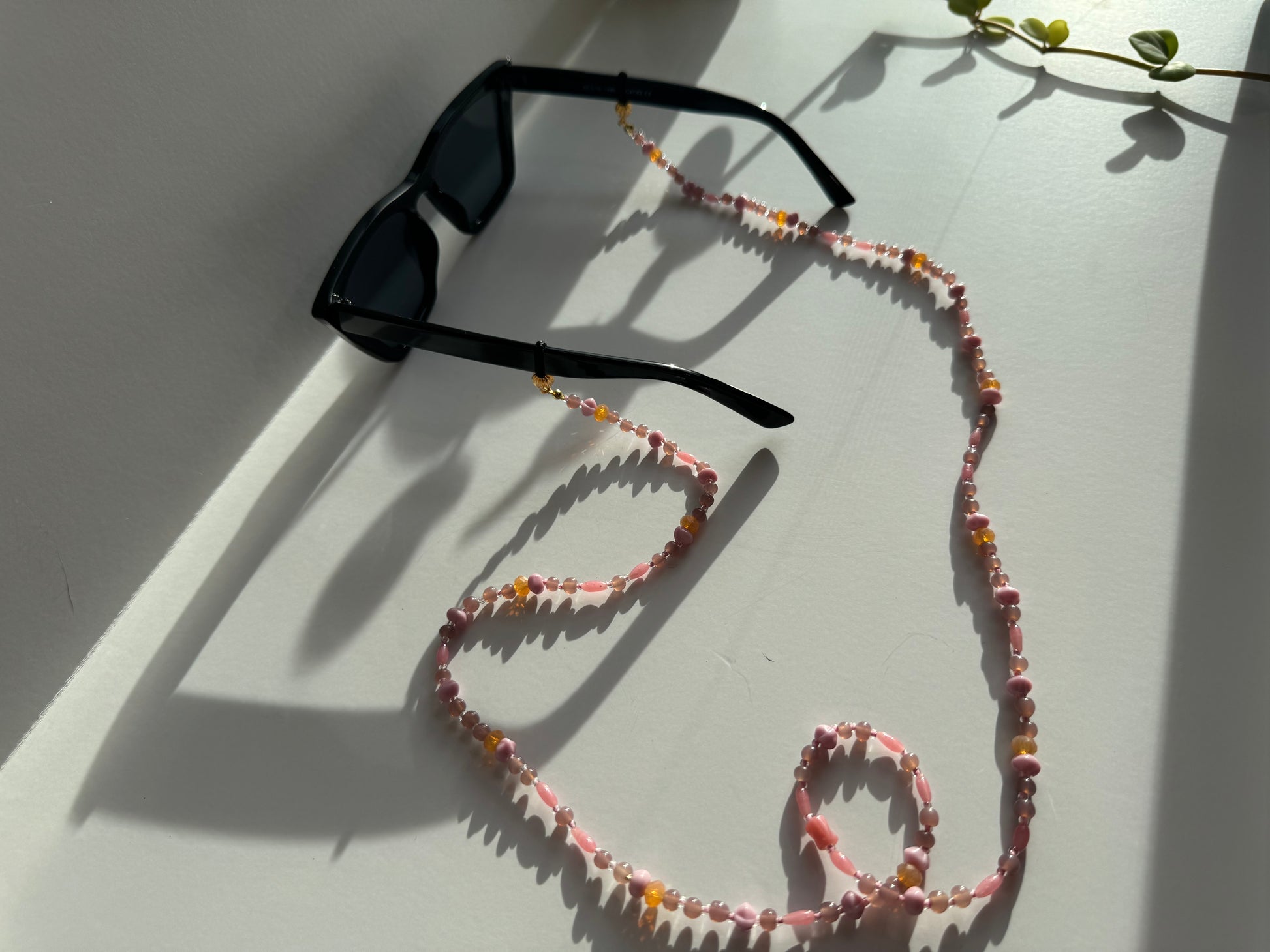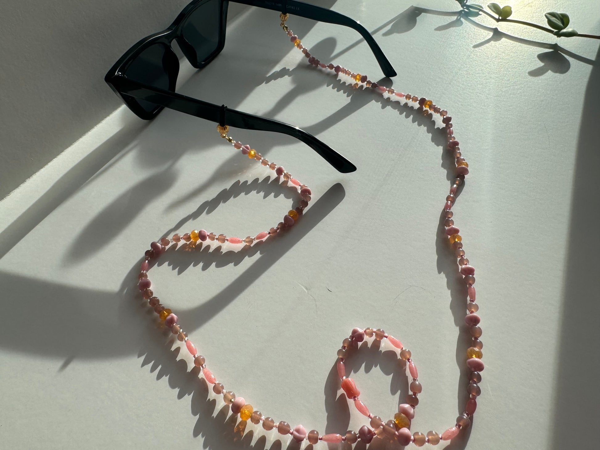 At each ends of the beaded chain are the uniquely designed adjustable gold loops. These are constructed to conveniently fit the particular size arms of your glasses, while giving your look a more polished and decorative feel. The adjustable loops are made with gold filled chain that is pulled through a gold plated slider bead lined with silicone on the inside for a smooth glide.