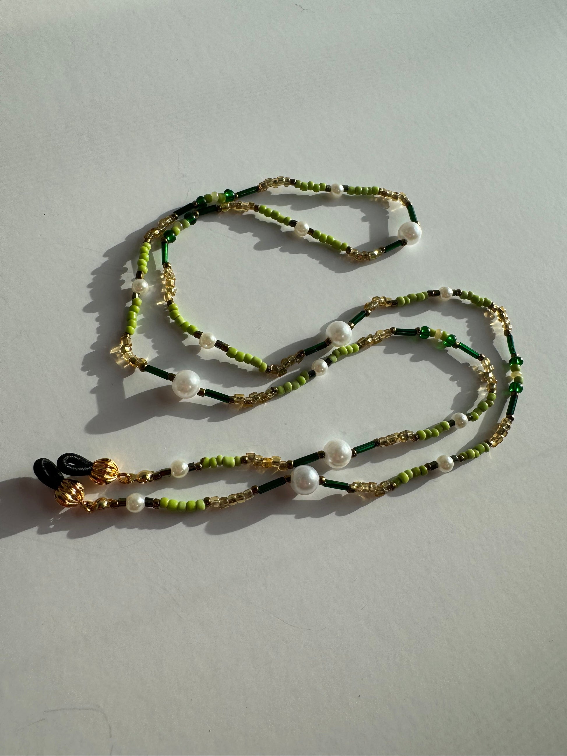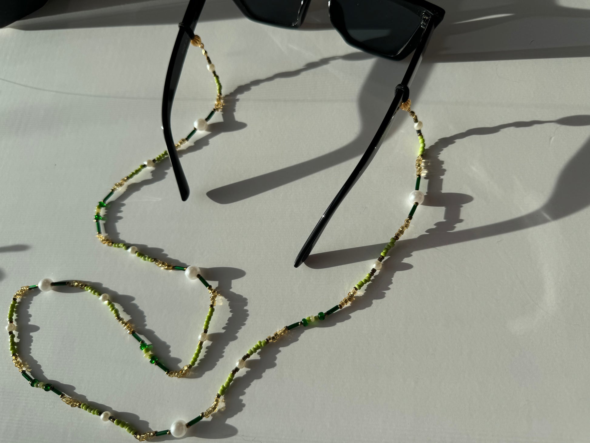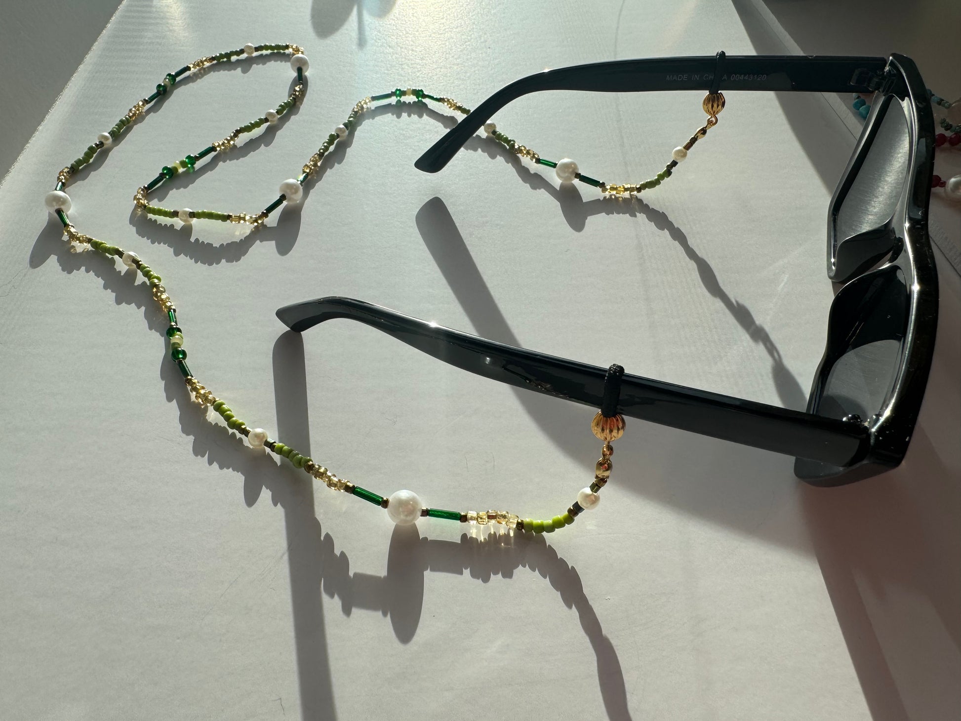 Designed and created by hand from beads and materials sourced from reclaimed jewelry, each Sunglasses Chain is a one-of-a-kind work of art (just like you) and it’s stretchy grip holders fit most sizes of glasses arms, so it can be worn on any type and style of glasses (sunglasses, prescription glasses, blue light blockers, etc.).