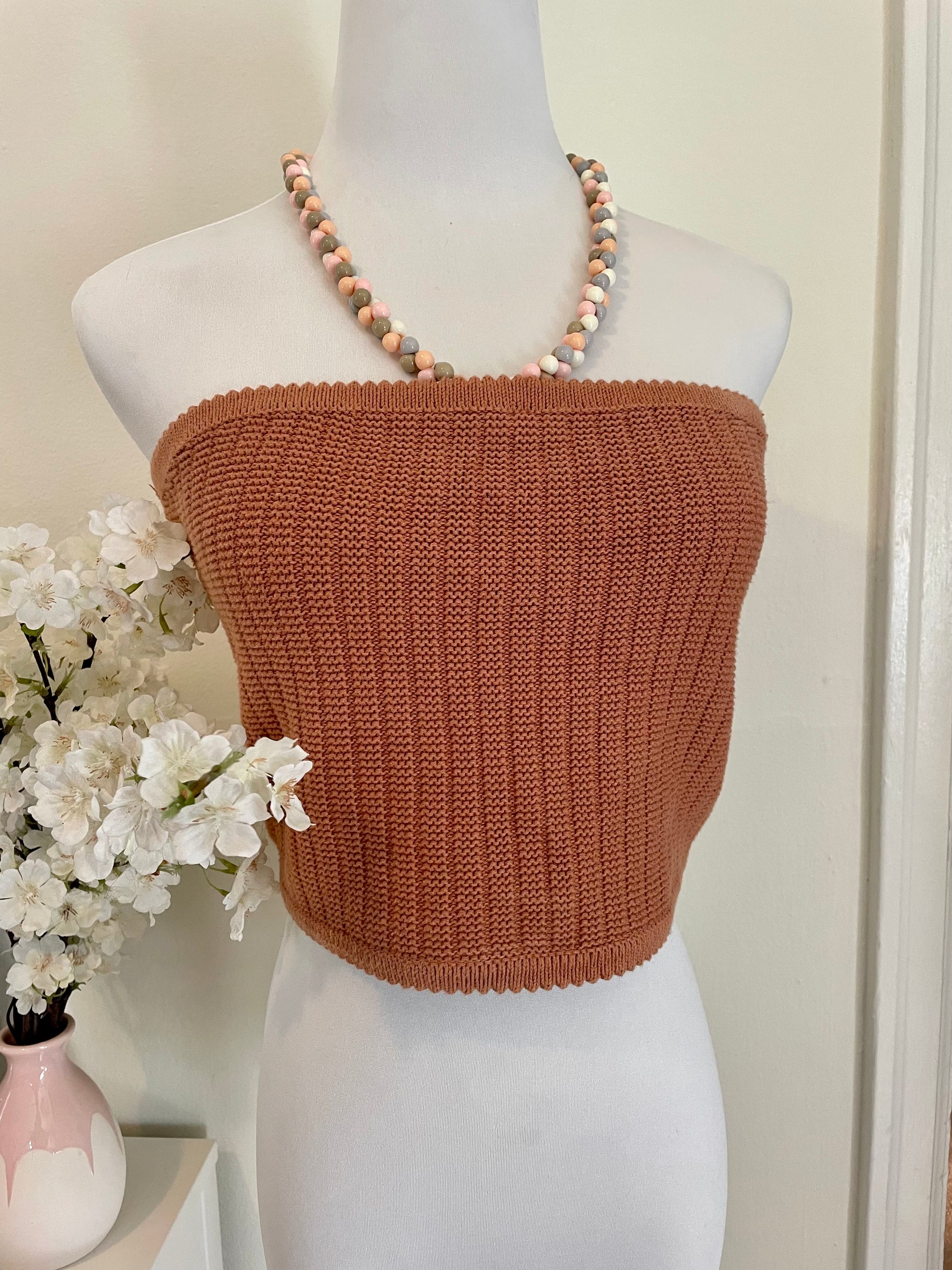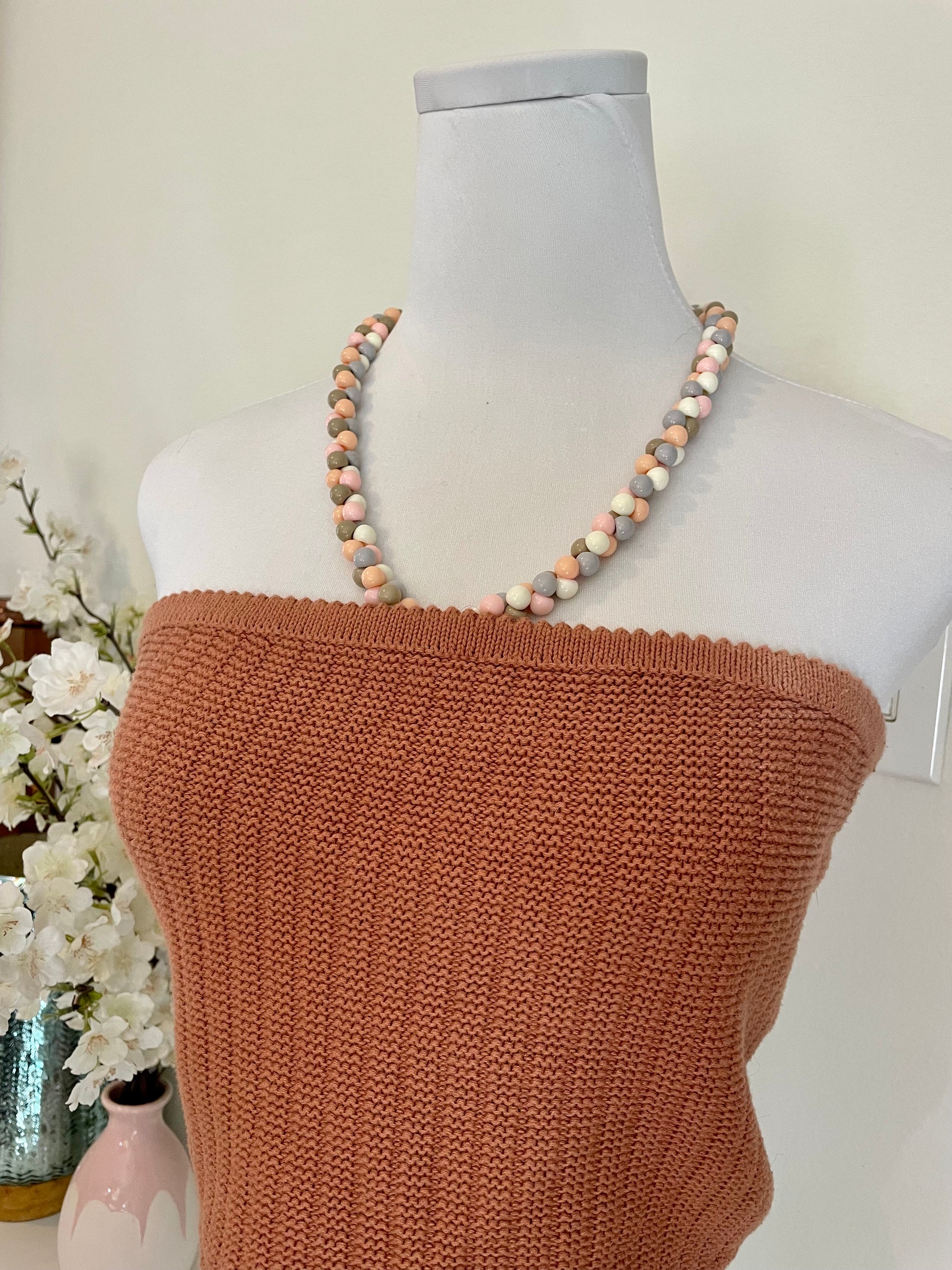 Beadazzled with: Vintage pastel drop beads around neck. Clasps to knitted top in front center