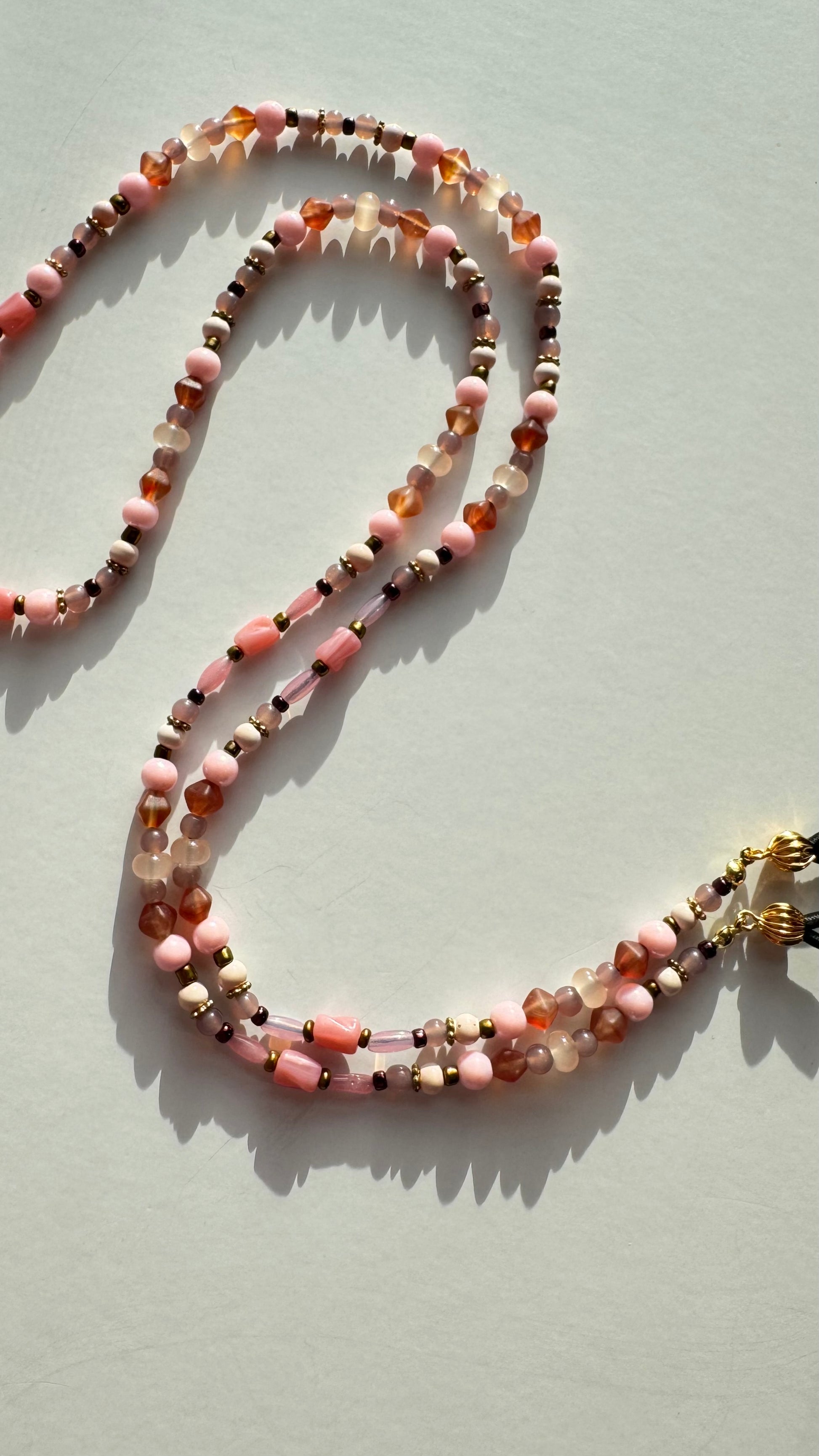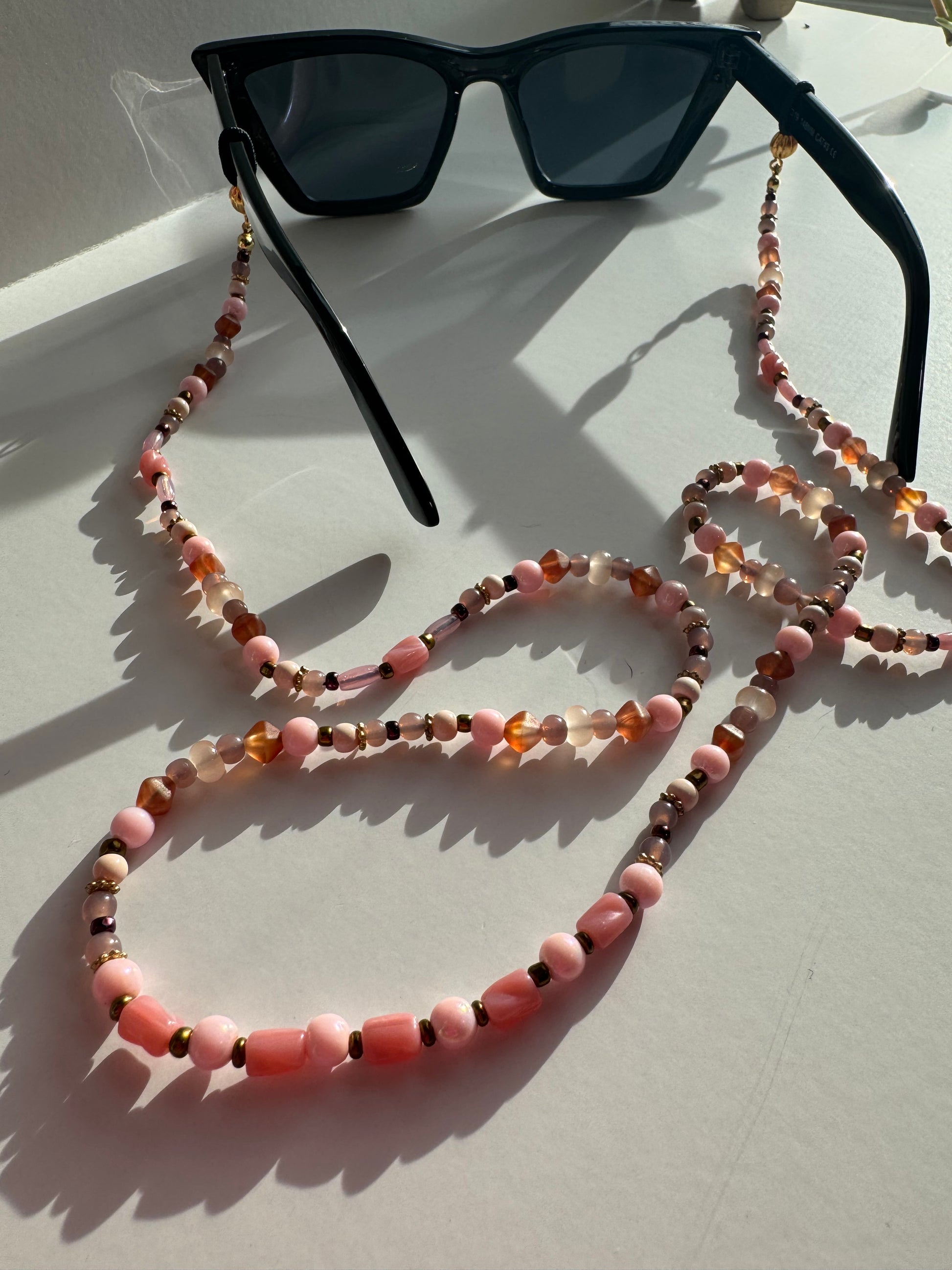 At each ends of the beaded chain are the uniquely designed adjustable gold loops. These are constructed to conveniently fit the particular size arms of your glasses, while giving your look a more polished and decorative feel. The adjustable loops are made with gold filled chain that is pulled through a gold plated slider bead lined with silicone on the inside for a smooth glide.