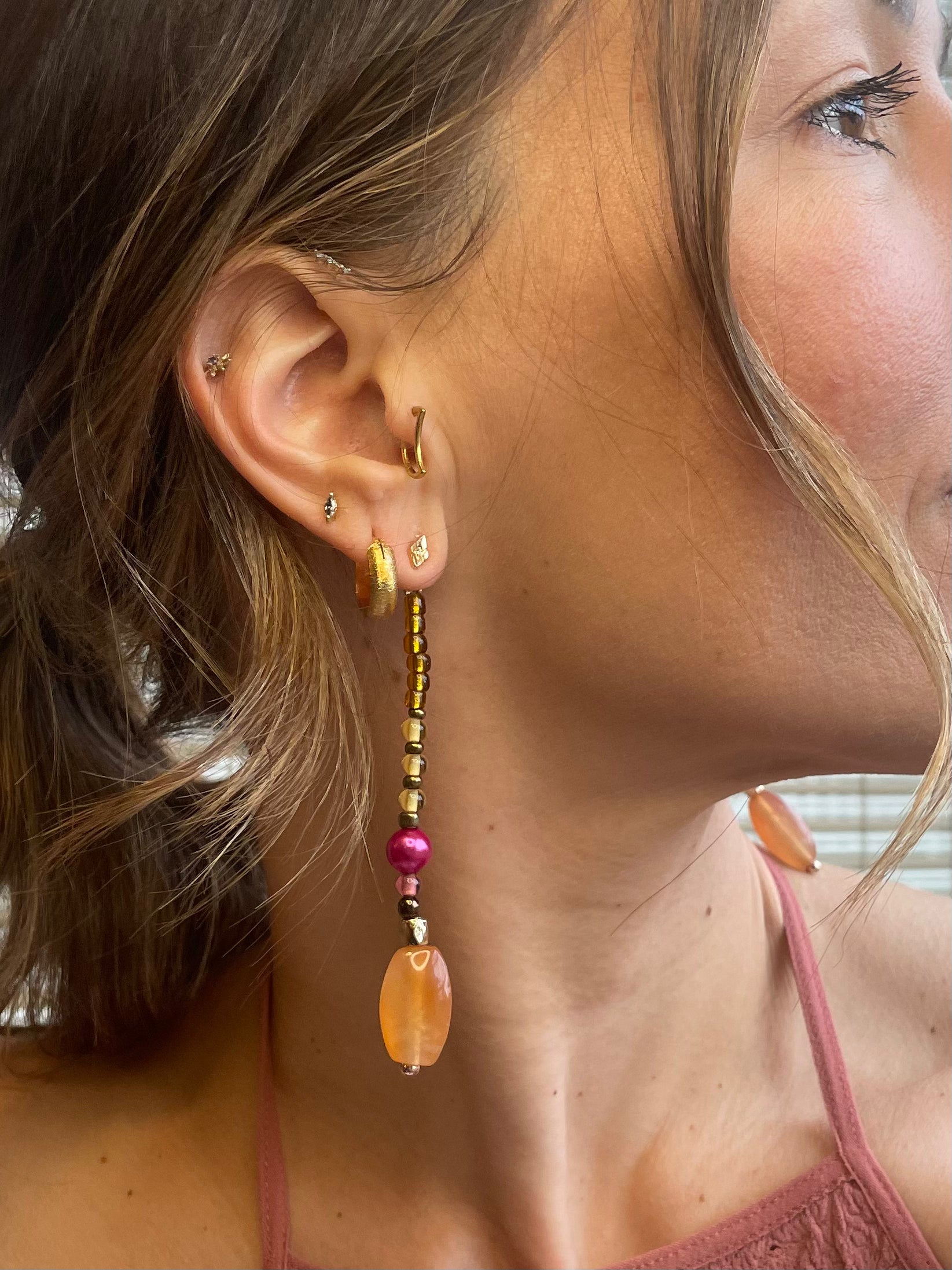 Transform a pair of stud earrings into bold statement earrings with CHAiNGE Statement Earring Jackets.  Expand your earring wardrobe and create new looks by adding these unique earring accessories to any stud/post earrings of your choice.   At the top of each jacket is a 14k gold plated gold loop. Attach the post of your stud earring through the hole of the gold loop after it is pushed through your lobe. Then secure your earring as you normally would with an earring backing. The earring jacket will hang down behind your ear lobe, creating a unique, dimensional look. *Sold as pair. Any stud earrings seen in images are for showcase purposes only, stud earrings not included.