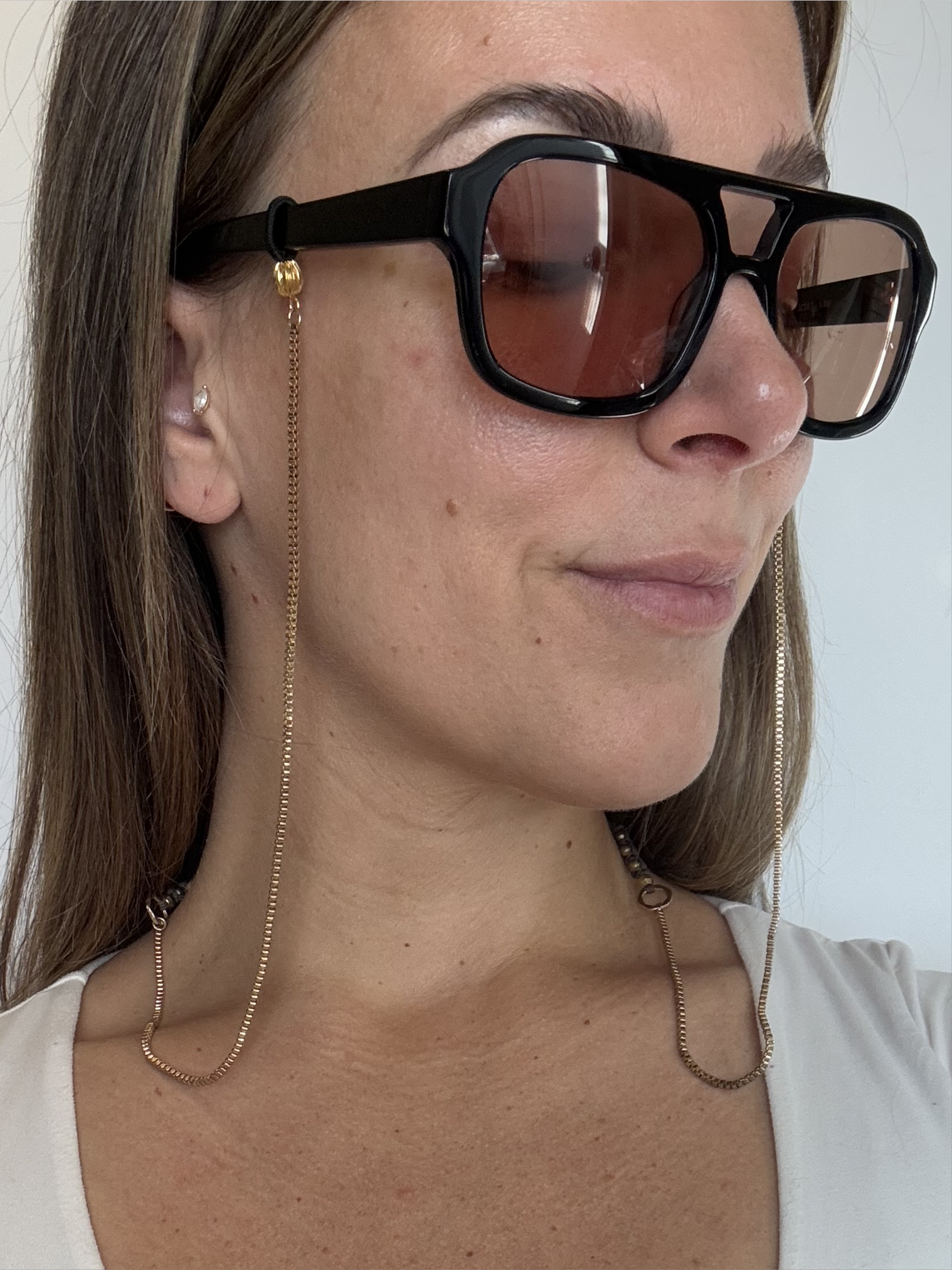 Reworked from a discarded necklace, this sunglasses chain is made from gold plated box chain and brown cord thats brained with brass beads woven throughout the design. We love that it's super lightweight and adjustable!