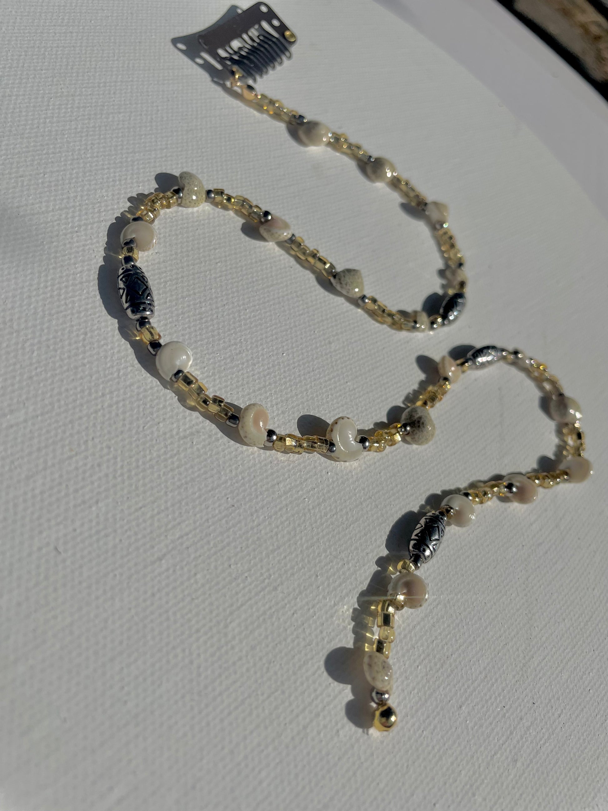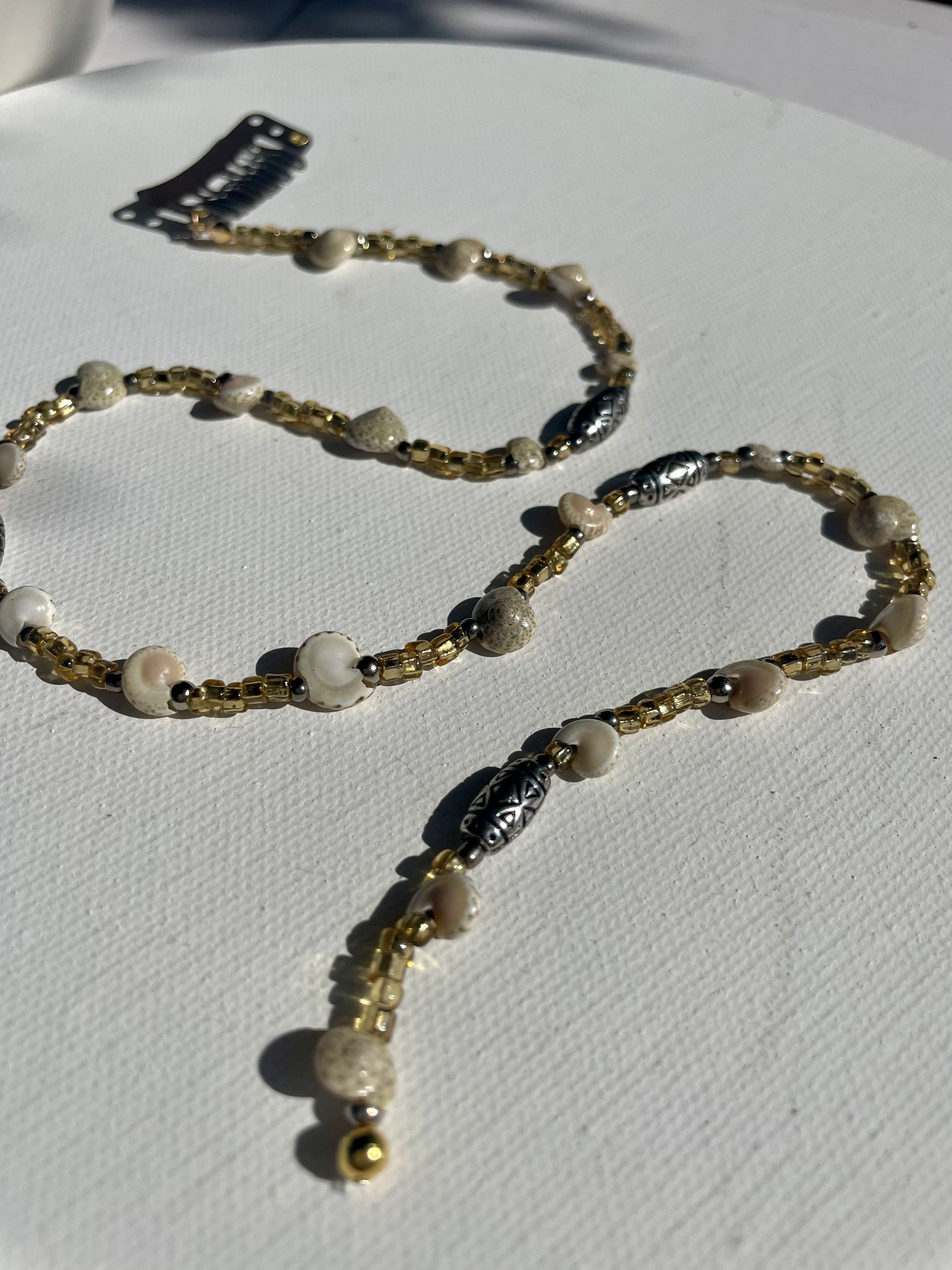 Be beachy-chic with this unique Under The Boardwalk Hair Chain! Crafted with seashell beads and other materials upcycled from reclaimed jewelry, this single-strand hair accessory will make you the star of the show. It's hidden comb clip will easily attach to your head by clipping underneath a layer of your hair.