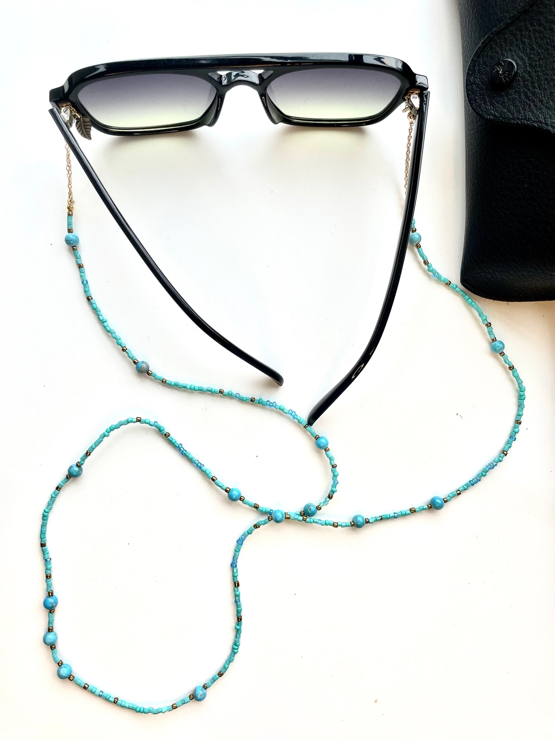 At each ends of the beaded chain are the uniquely designed adjustable gold loops. These are constructed to conveniently fit the particular size arms of your glasses, while giving your look a more polished and decorative feel. The adjustable loops are made with gold filled chain that is pulled through a sterling silver slider bead lined with silicone on the inside for a smooth glide.