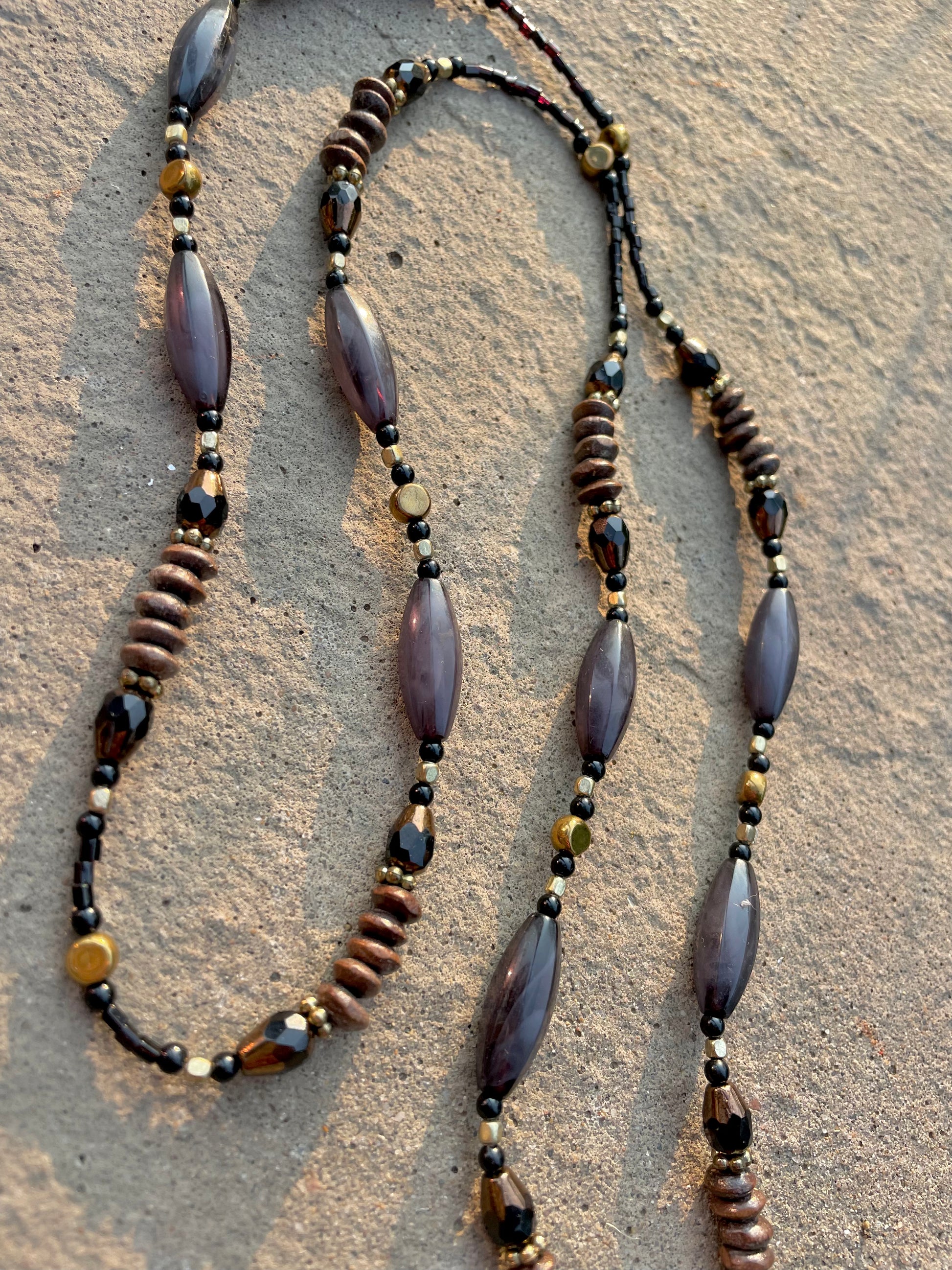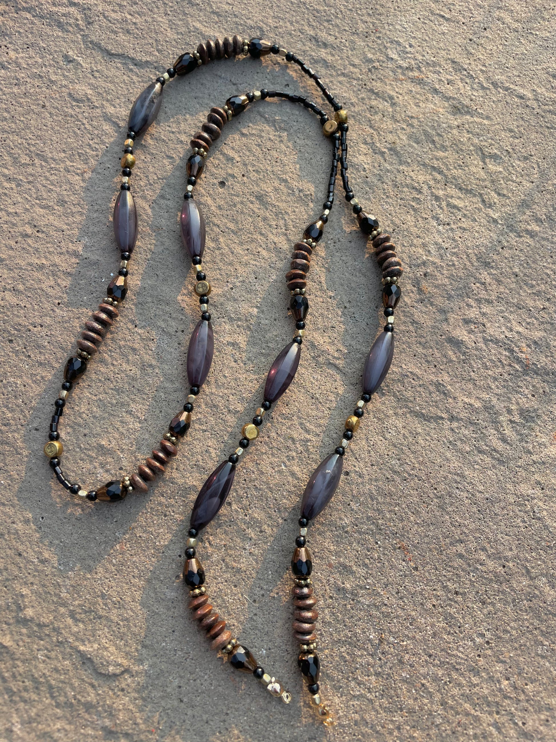 Designed and created by hand from beads and materials sourced from reclaimed jewelry, each Sunglasses Chain is a one-of-a-kind work of art (just like you) and it’s stretchy grip holders fit most sizes of glasses arms, so it can be worn on any type and style of glasses (sunglasses, prescription glasses, blue light blockers, etc.).