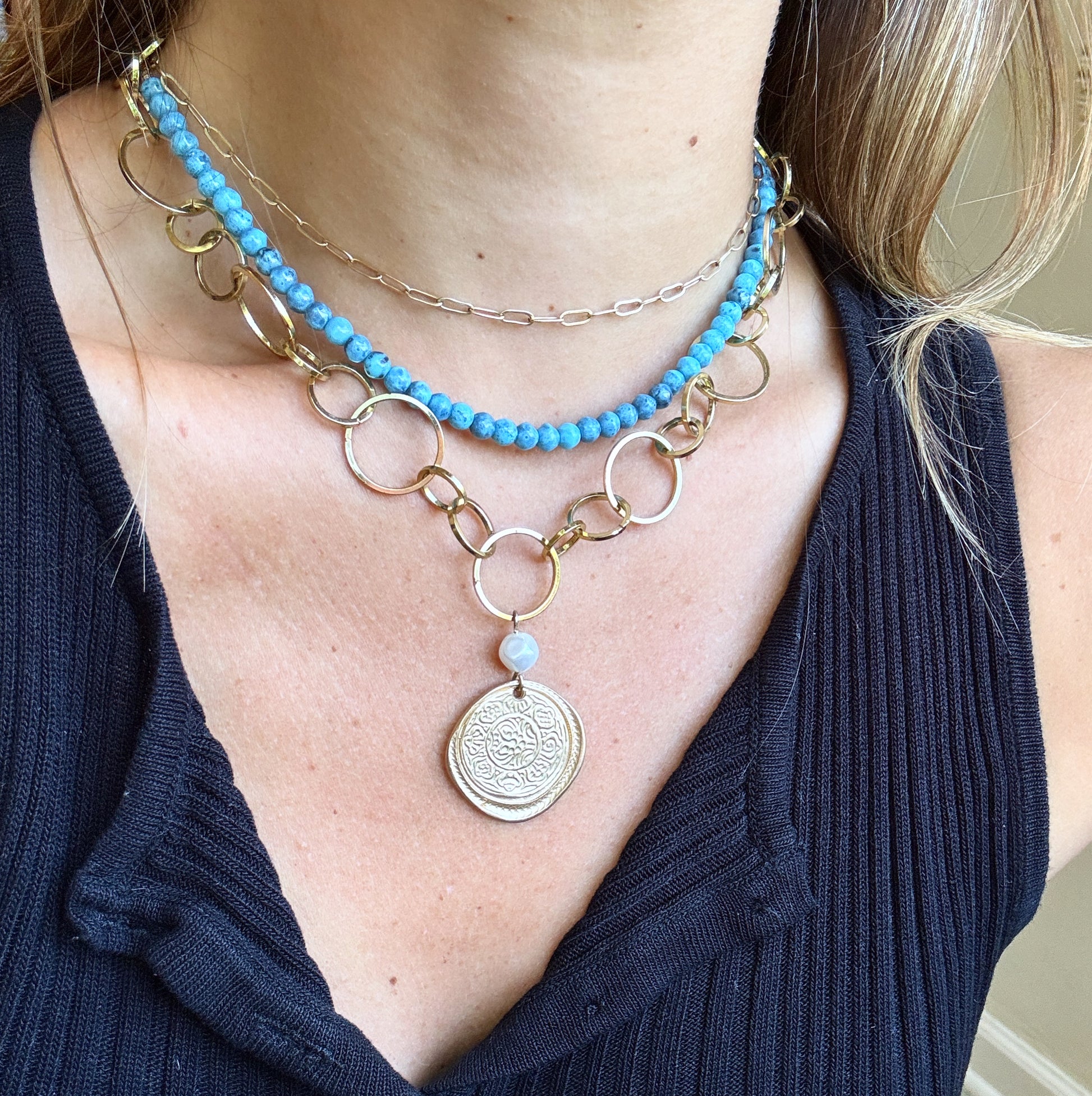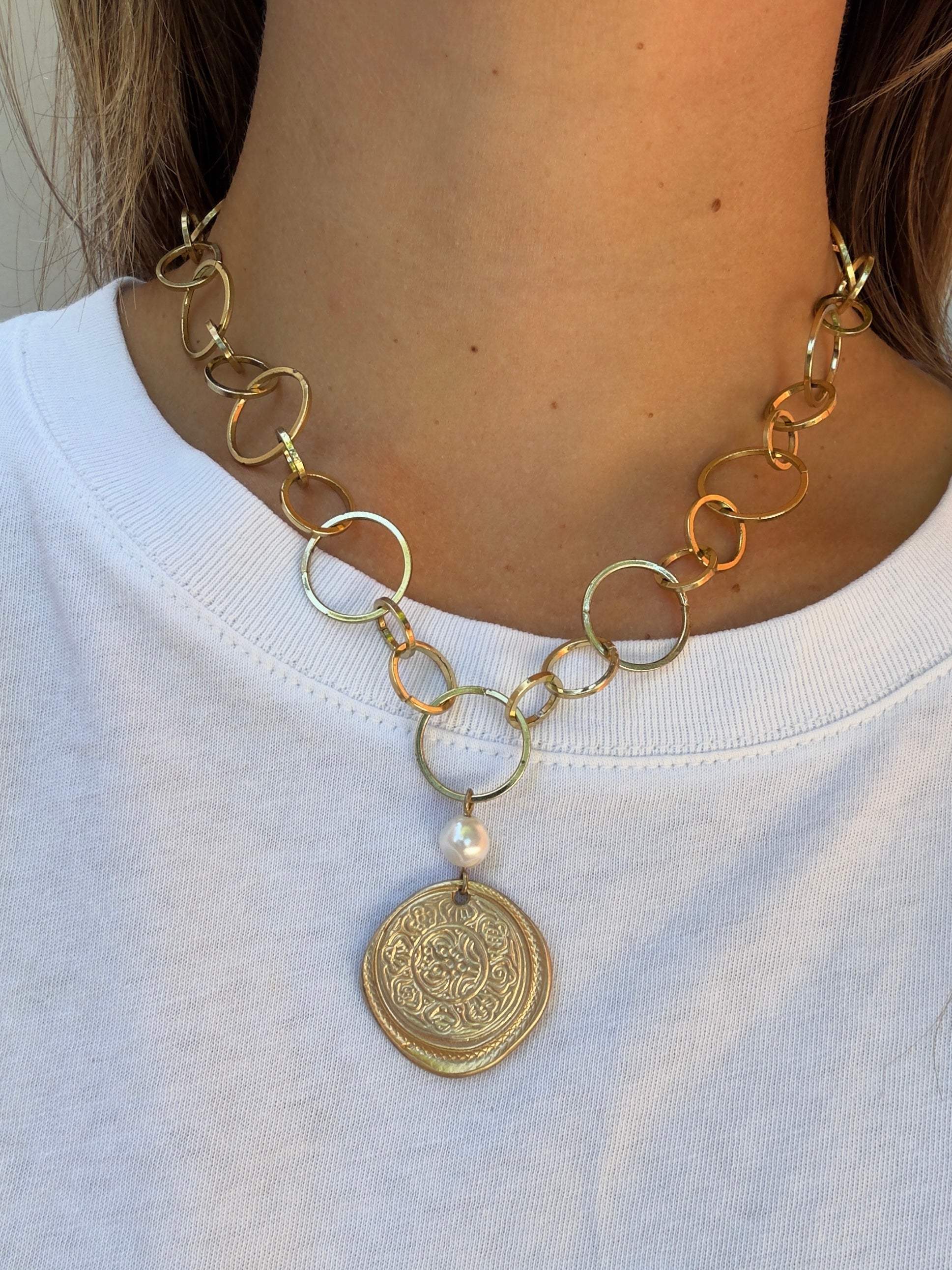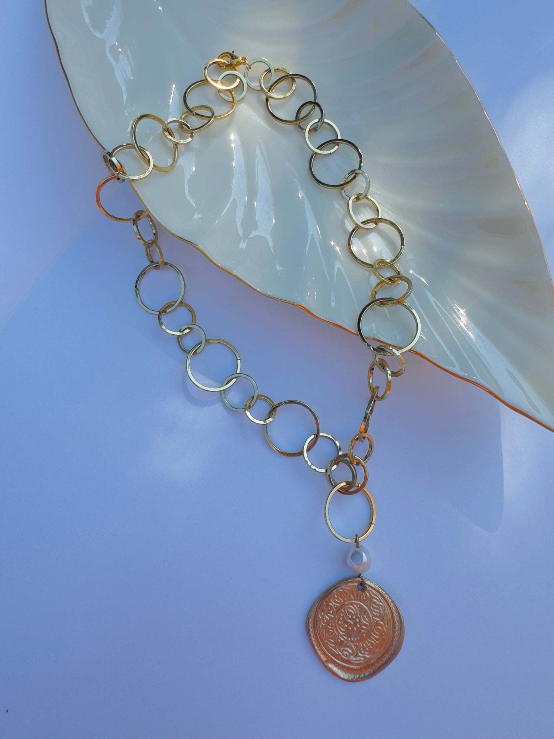 Upcycled using Gold-tone chunky chain made of interlocking round links, with a circular pendant resembling an ancient coin that serves as the centerpiece of the necklace. Asingle pearl dangles above the coin pendant adding a touch of elegance and contrasting texture.