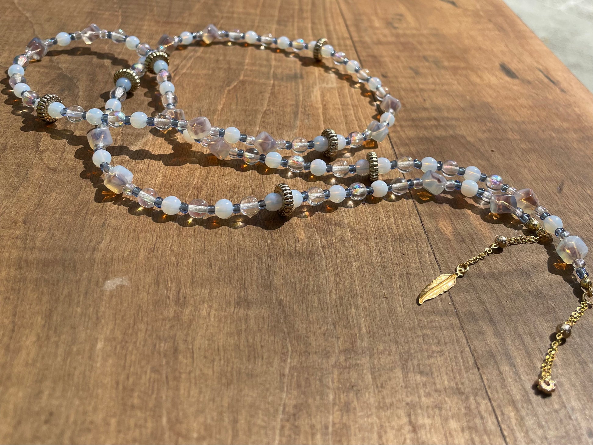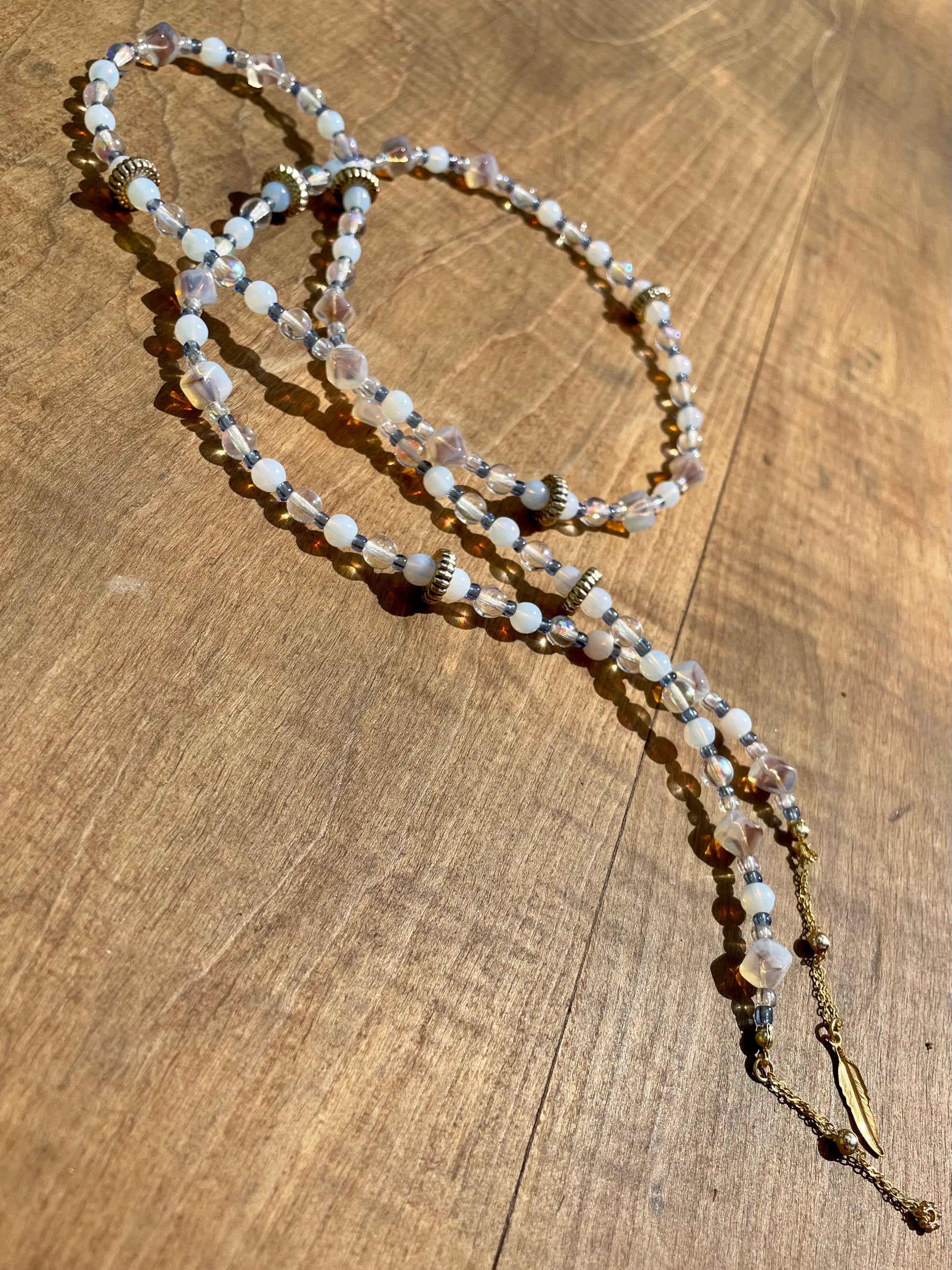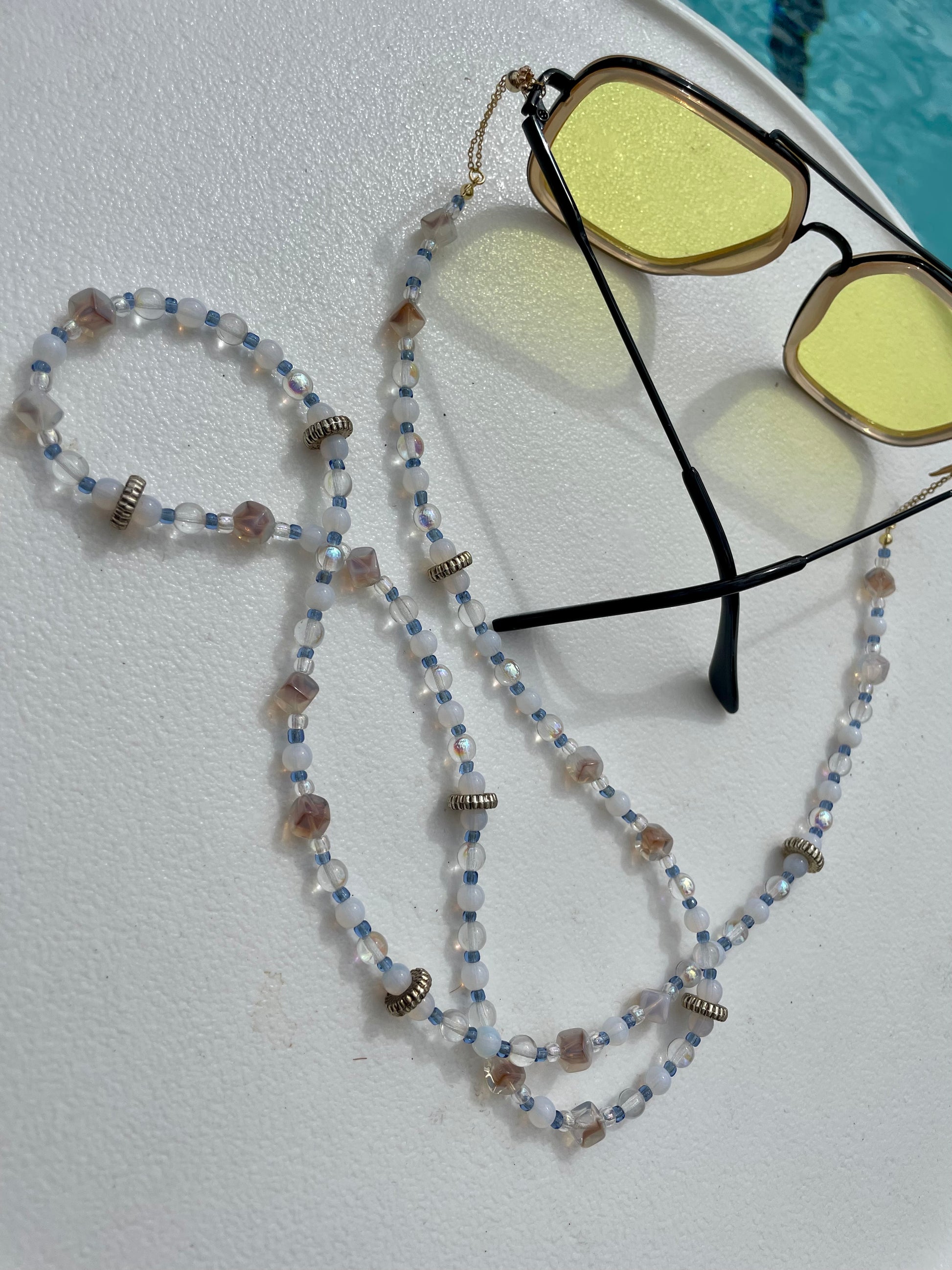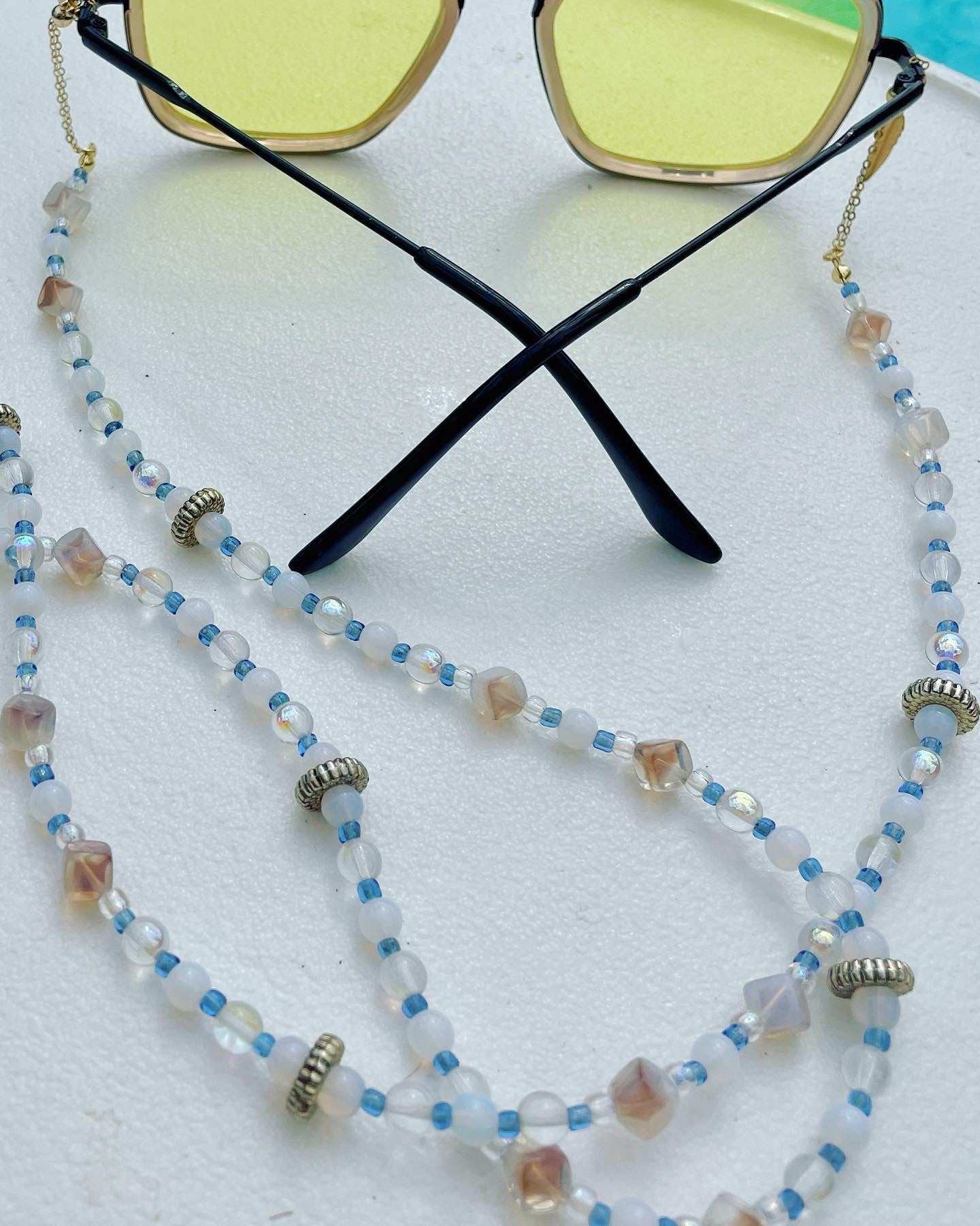 At each ends of the beaded chain are the uniquely designed adjustable gold loops. These are constructed to conveniently fit the particular size arms of your glasses, while giving your look a more polished and decorative feel. The adjustable loops are made with gold filled chain that is pulled through a gold plated slider bead lined with silicone on the inside for a smooth glide.