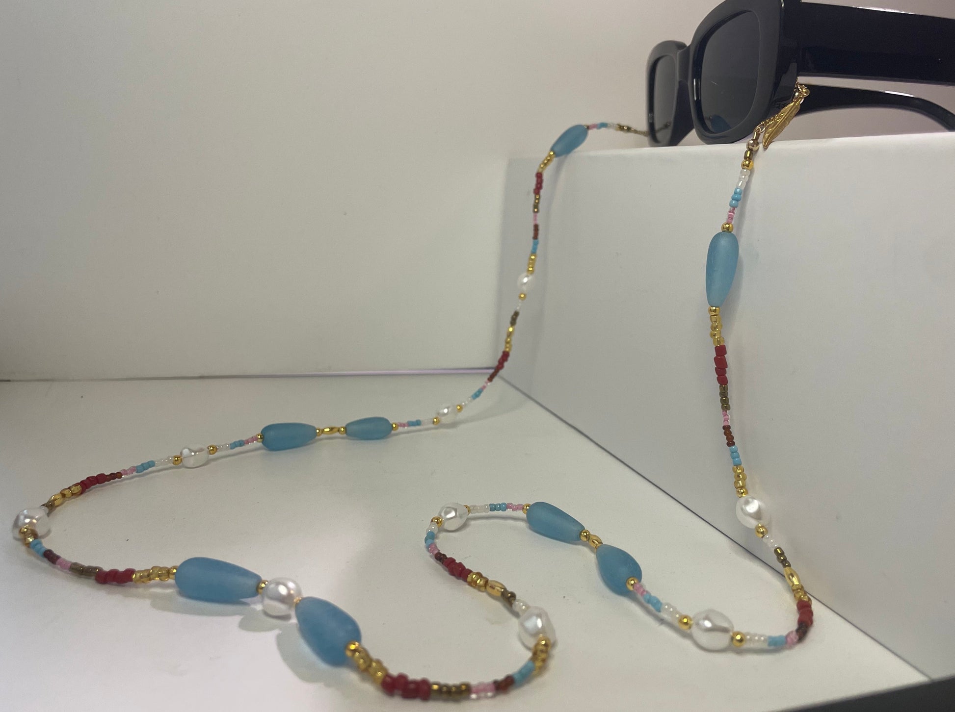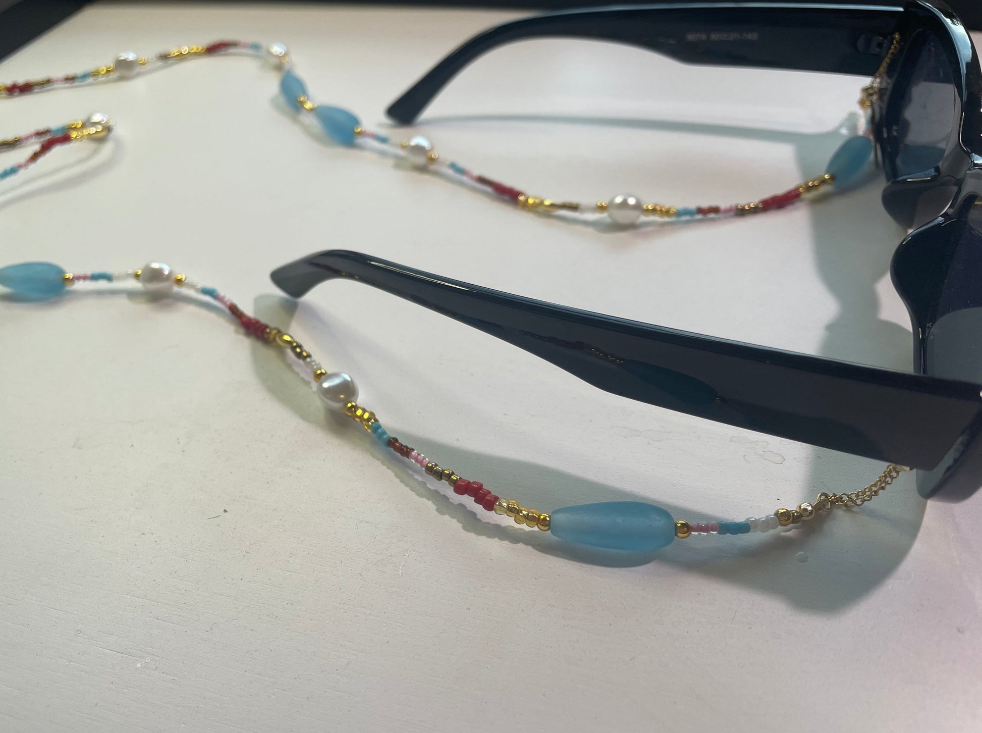 At each ends of the beaded chain are the uniquely designed adjustable gold loops. These are constructed to conveniently fit the particular size arms of your glasses, while giving your look a more polished and decorative feel. The adjustable loops are made with gold filled chain that is pulled through a sterling silver slider bead lined with silicone on the inside for a smooth glide.