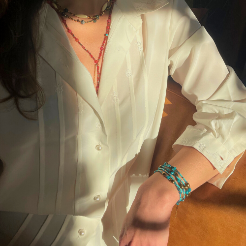The gold loops are specifically designed to connect with each other so that the accessory chain can also be worn on your body. Wrap it around your neck, wrist, ankle, or torso and connect the ends by sliding the sun charm at the end of one gold loop through the other gold loop. Then slide the silver bead up to tighten/fasten together.