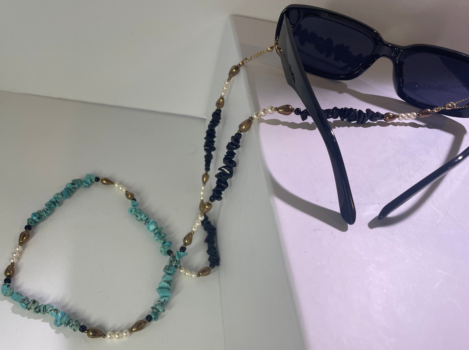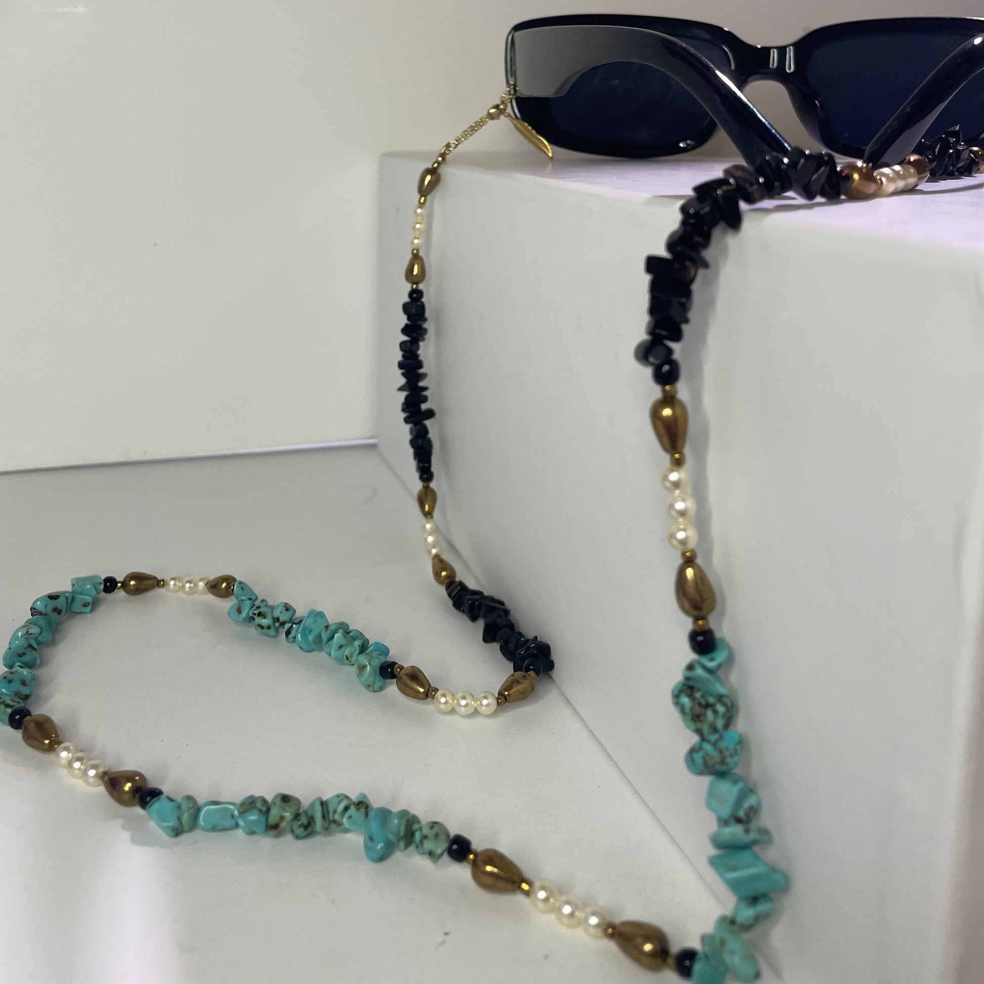 At each ends of the beaded chain are the uniquely designed adjustable gold loops. These are constructed to conveniently fit the particular size arms of your glasses, while giving your look a more polished and decorative feel. The adjustable loops are made with gold filled chain that is pulled through a sterling silver slider bead lined with silicone on the inside for a smooth glide.
