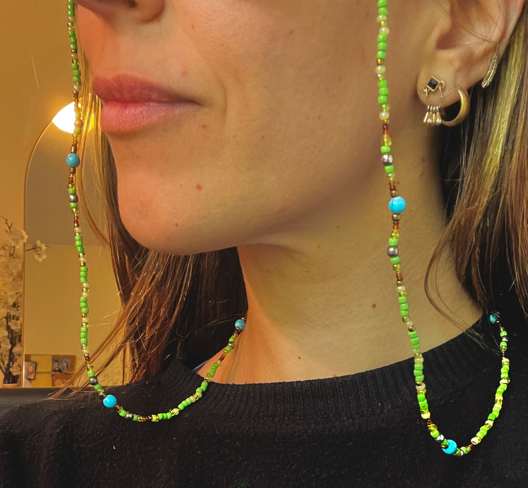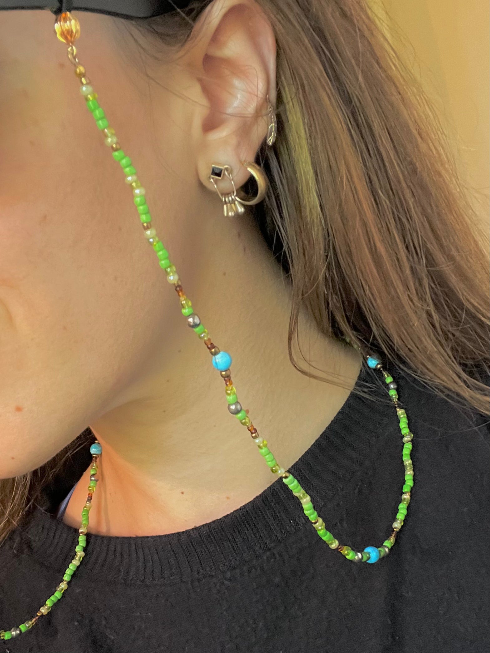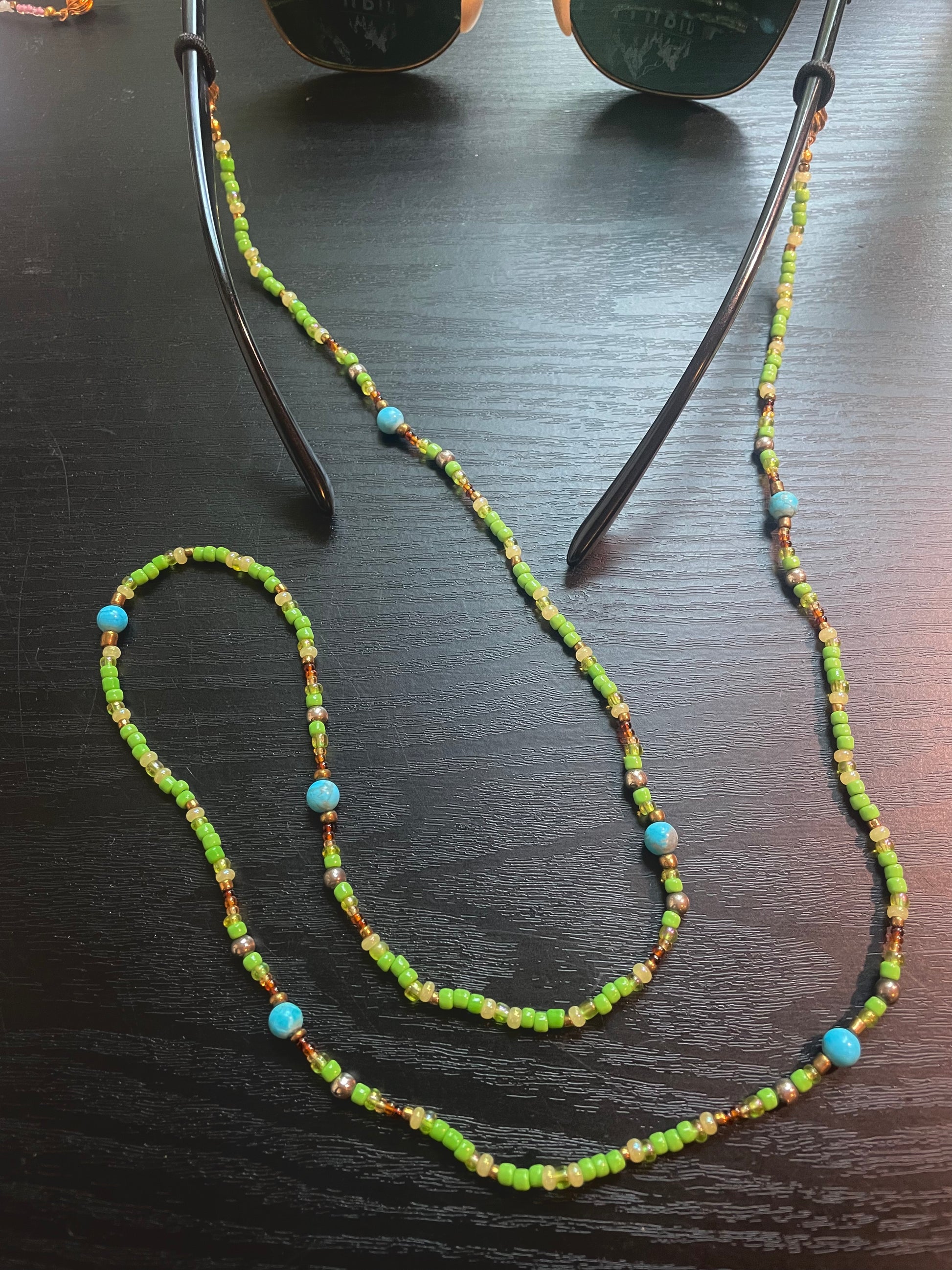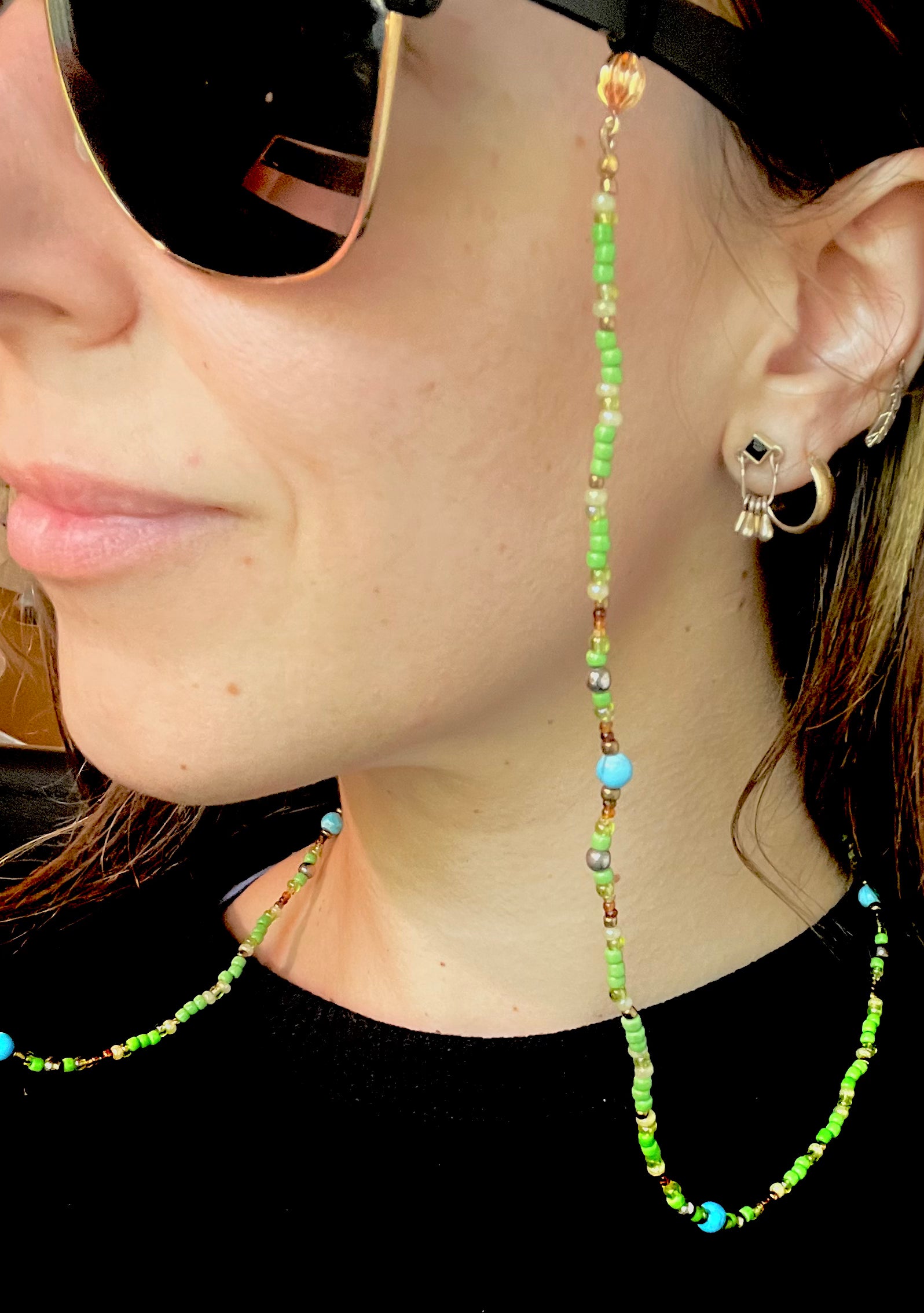 Designed and created by hand from beads and materials sourced from reclaimed jewelry, each Sunglasses Chain is a one-of-a-kind work of art (just like you) and it’s stretchy grip holders fit most sizes of glasses arms, so it can be worn on any type and style of glasses (sunglasses, prescription glasses, blue light blockers, etc.).