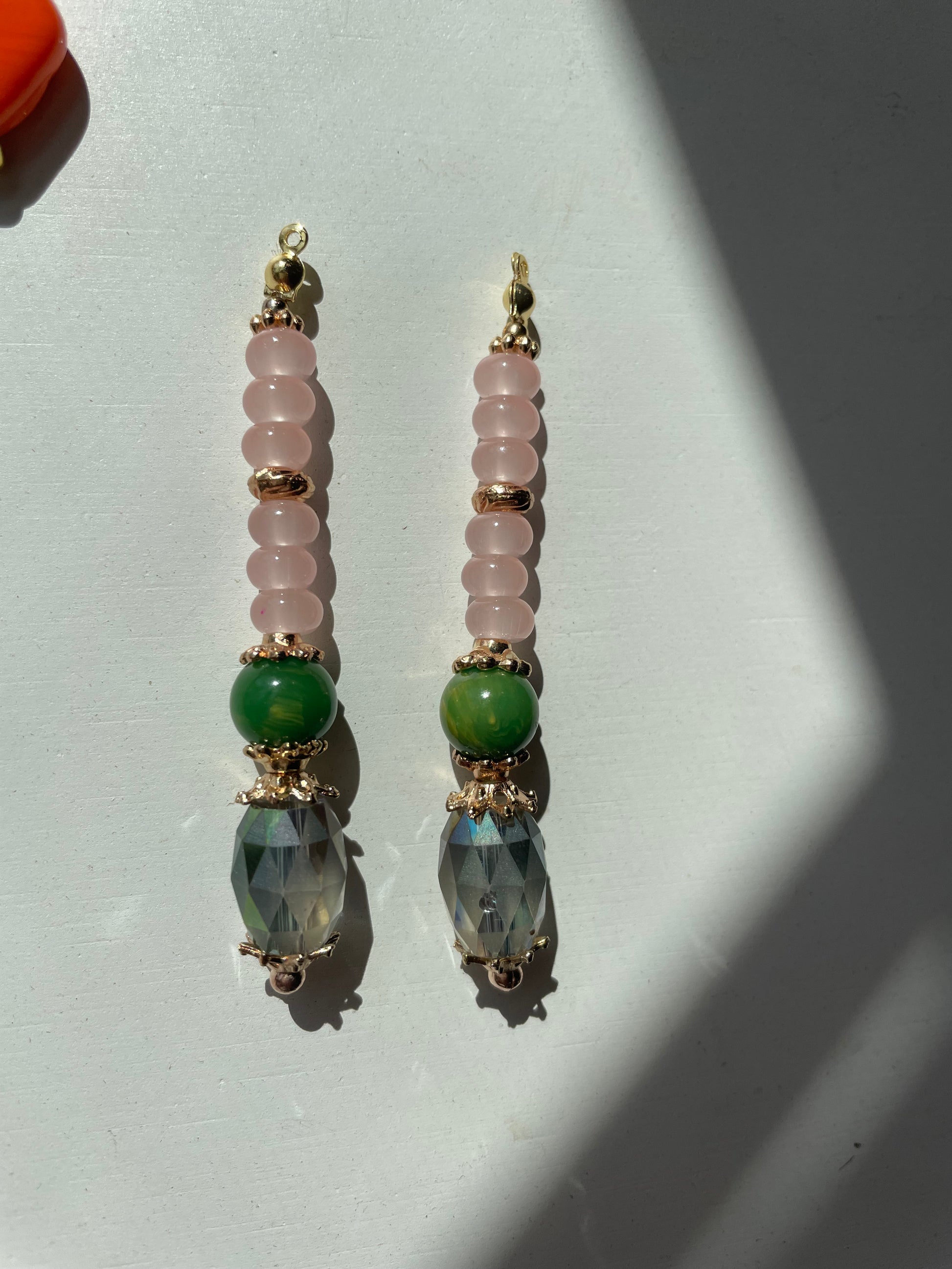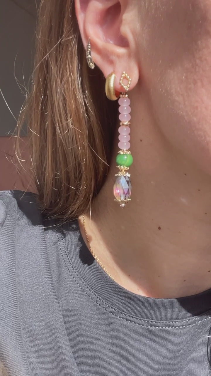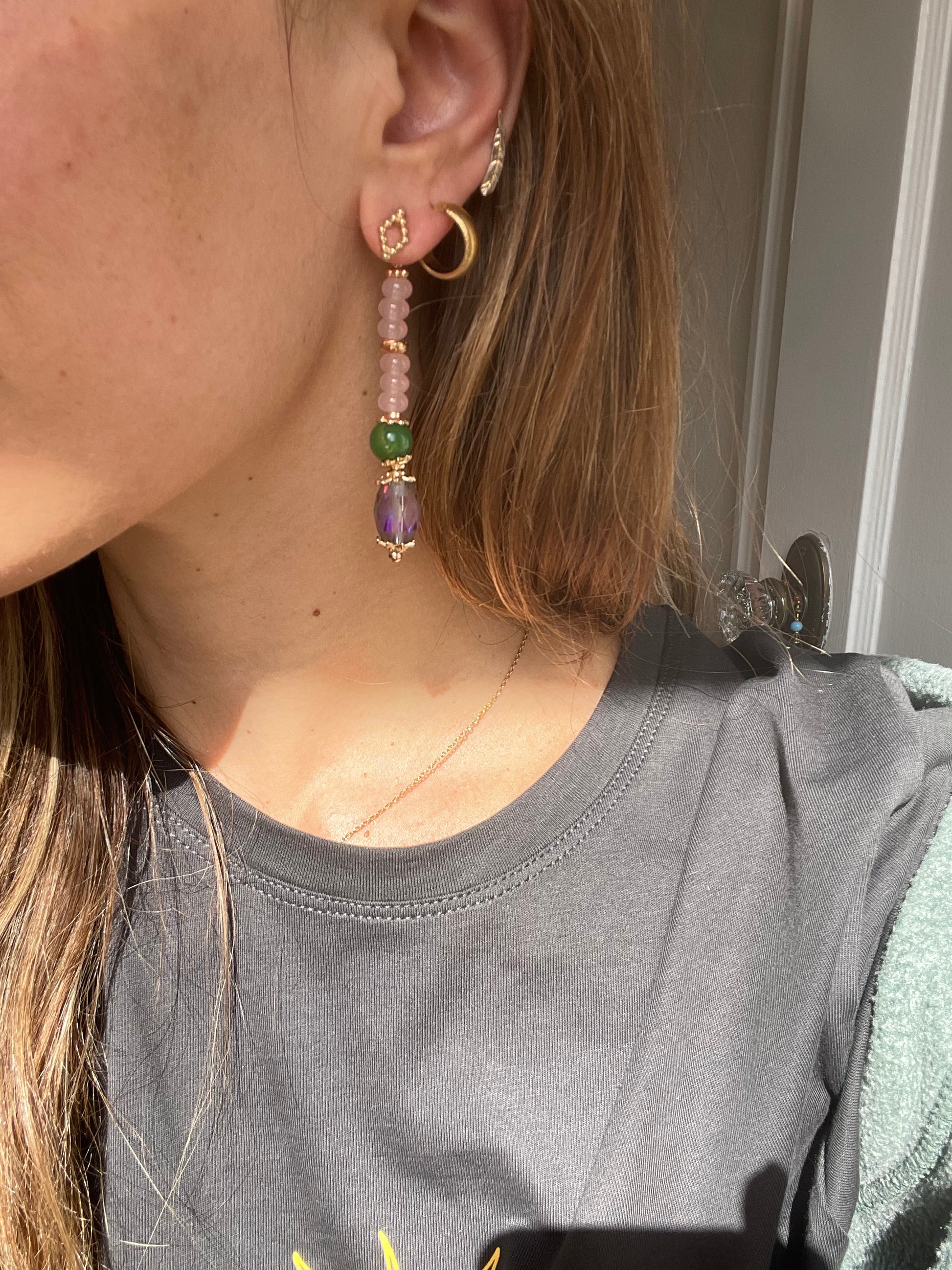 At the top of each jacket is a 14k gold plated gold loop. Attach the post of your stud earring through the hole of the gold loop after it is pushed through your lobe. Then secure your earring as you normally would with an earring backing. The earring jacket will hang down behind your ear lobe, creating a unique, dimensional look.