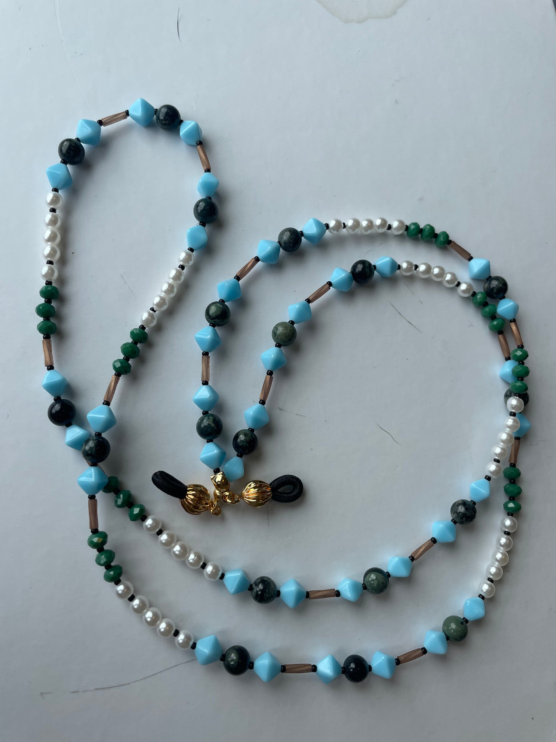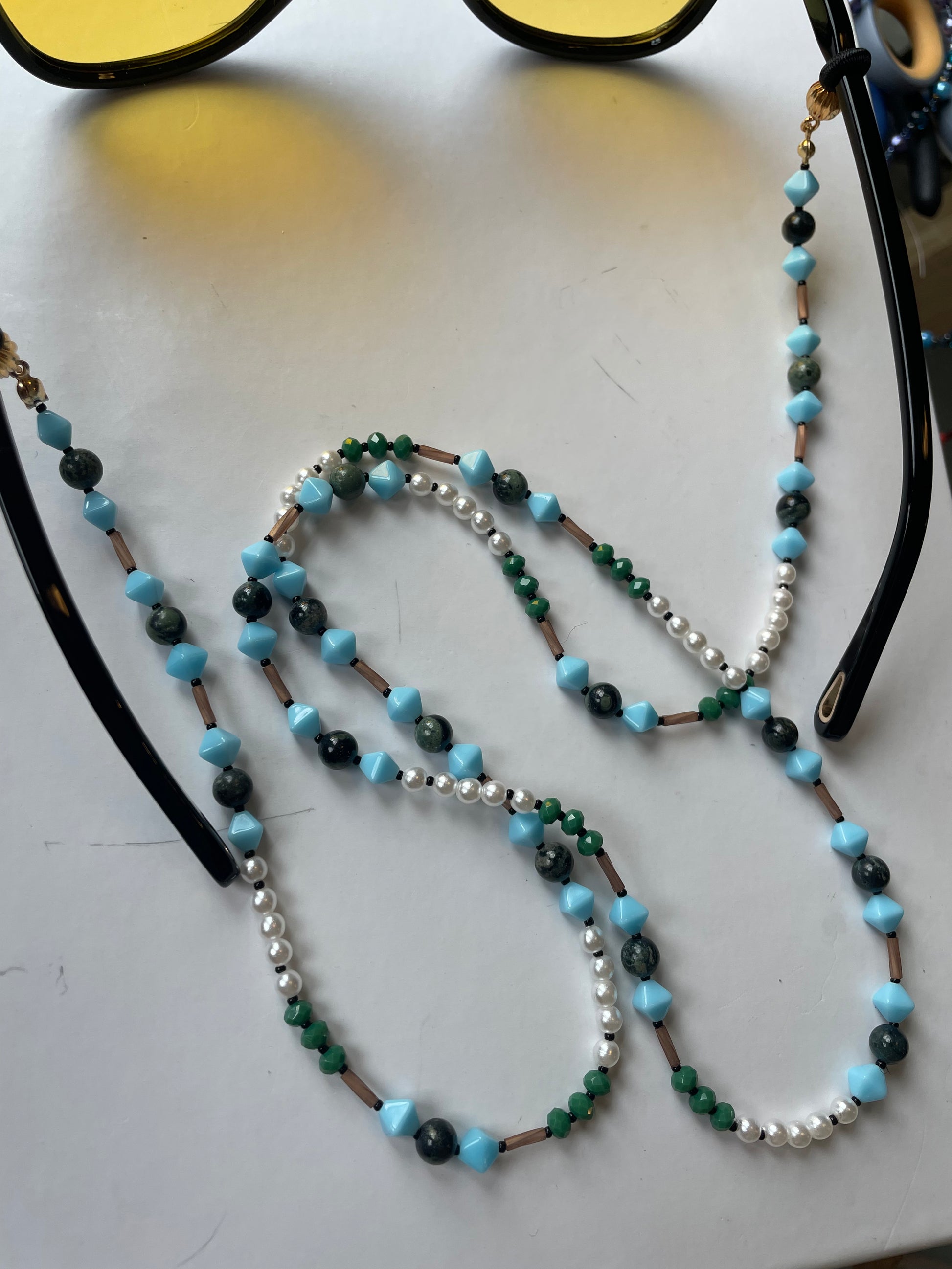 Designed and created by hand from beads and materials sourced from reclaimed jewelry, each Sunglasses Chain is a one-of-a-kind work of art (just like you) and it’s stretchy grip holders fit most sizes of glasses arms, so it can be worn on any type and style of glasses (sunglasses, prescription glasses, blue light blockers, etc.).