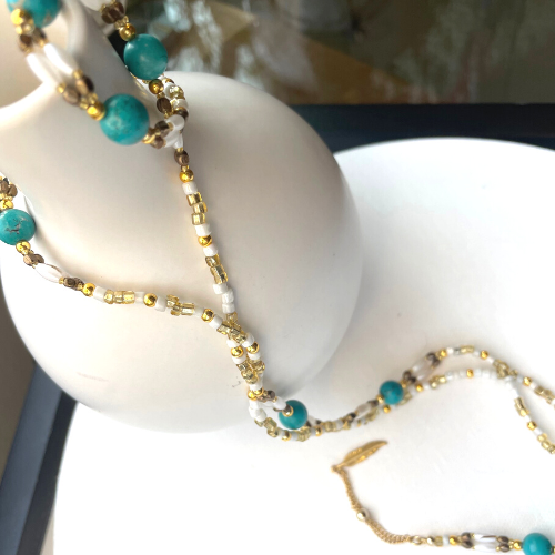 At each ends of the beaded chain are the uniquely designed adjustable gold loops. These are constructed to conveniently fit the particular size arms of your glasses, while giving your look a more polished and decorative feel. The adjustable loops are made with gold filled chain that is pulled through a sterling silver slider bead lined with silicone on the inside for a smooth glide.