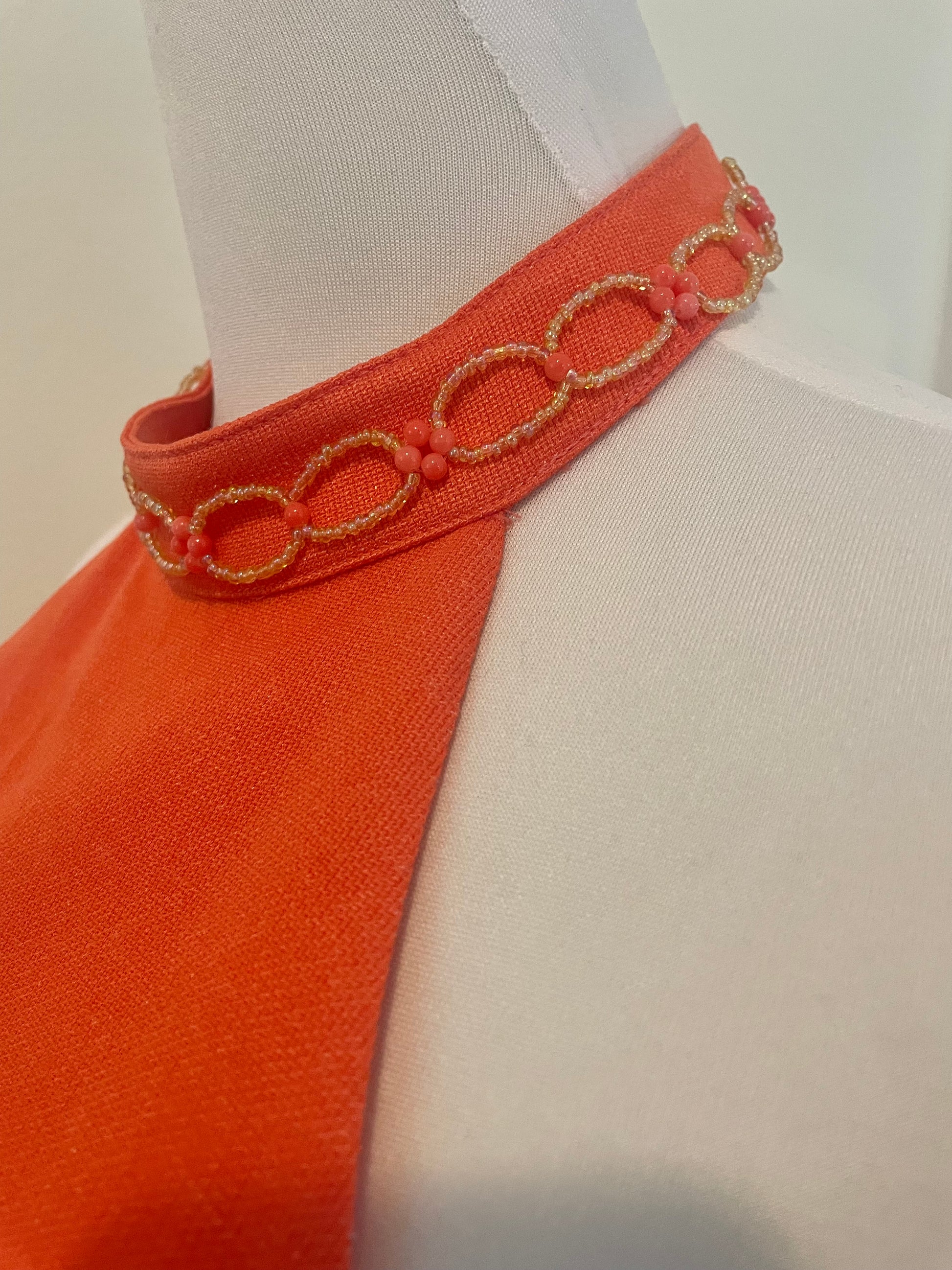Beadazzled With: yellow crystal seed beads and peach glazed glass round beads in a circle loop/flower patter around neckline and down center of bare back