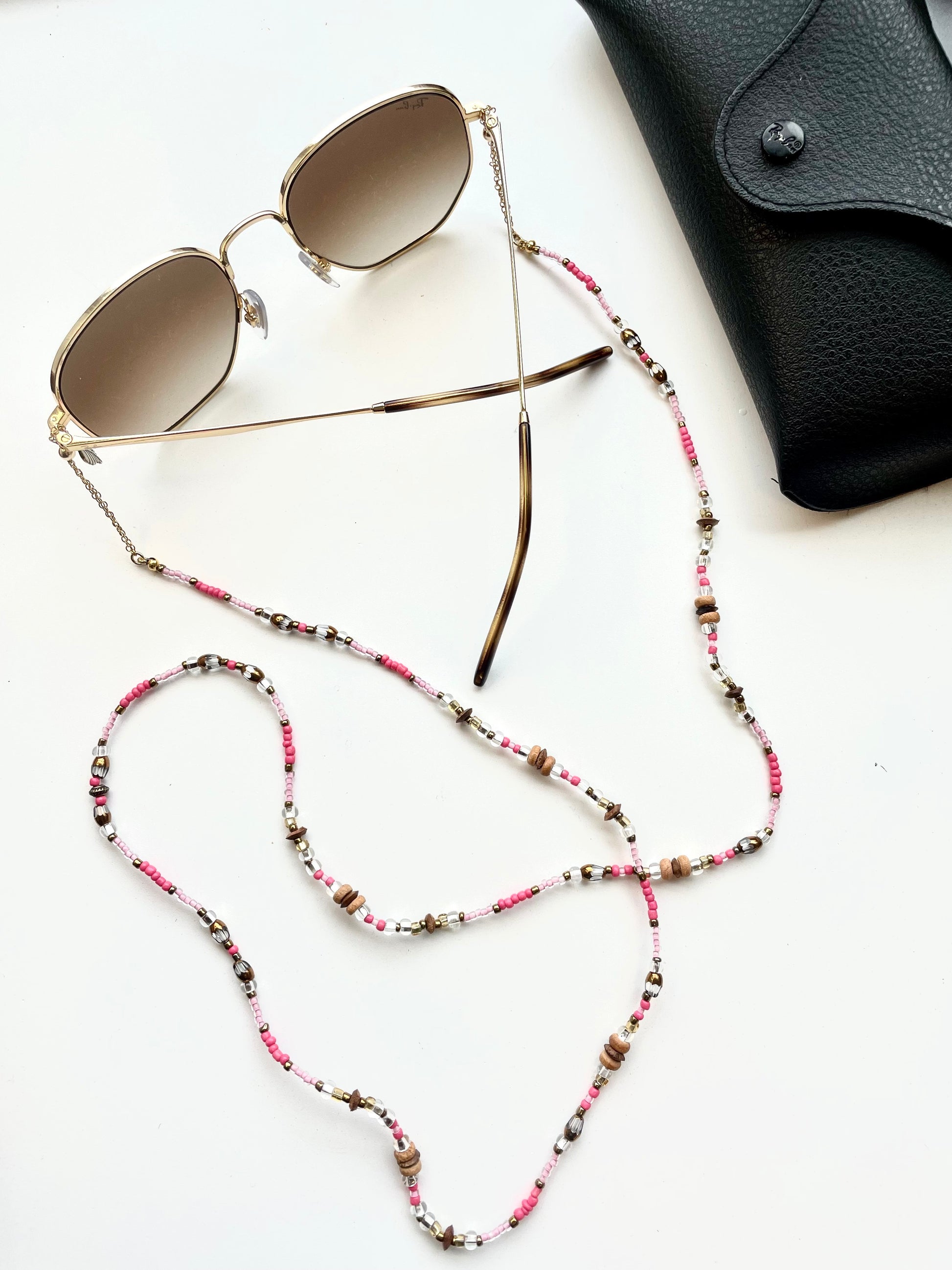 At each ends of the beaded chain are the uniquely designed adjustable gold loops. These are constructed to conveniently fit the particular size arms of your glasses, while giving your look a more polished and decorative feel. The adjustable loops are made with gold filled chain that is pulled through a sterling silver slider bead lined with silicone on the inside for a smooth glide.