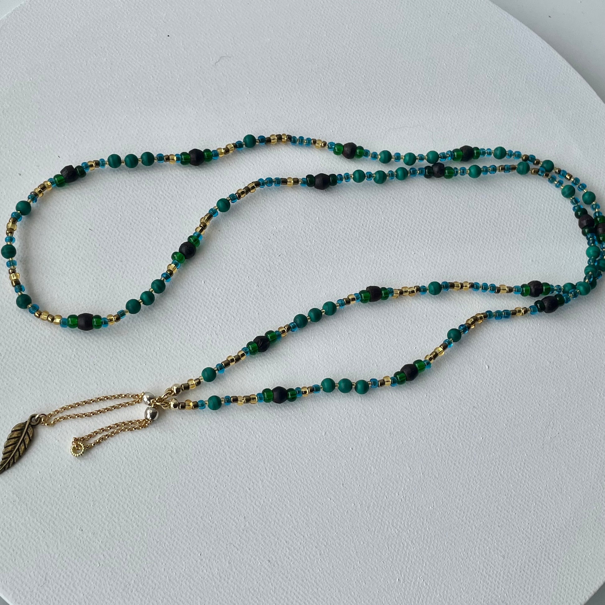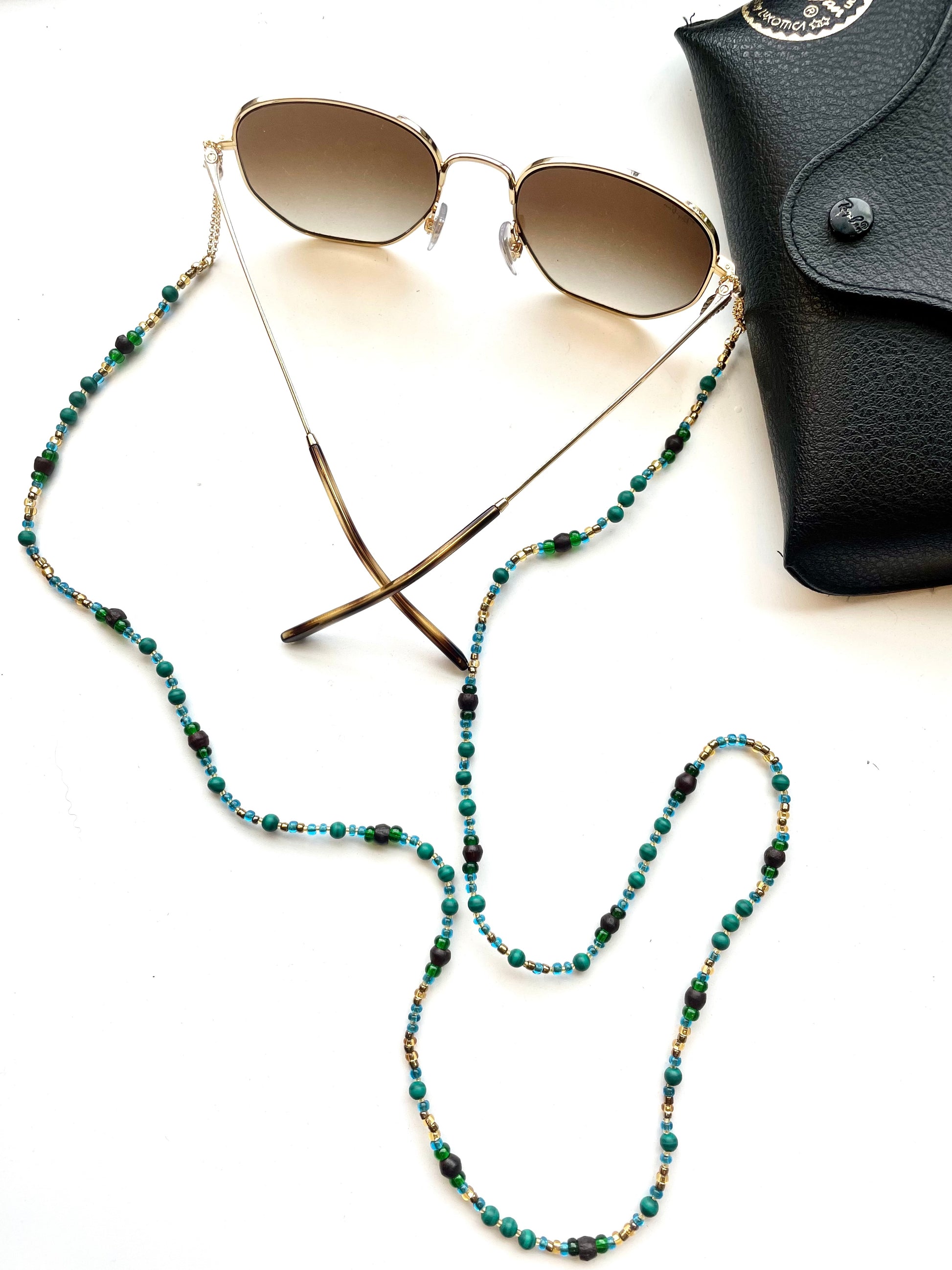 At each ends of the beaded chain are the uniquely designed adjustable gold loops. These are constructed to conveniently fit the particular size arms of your glasses, while giving your look a more polished and decorative feel. The adjustable loops are made with gold filled chain that is pulled through a sterling silver slider bead lined with silicone on the inside for a smooth glide.