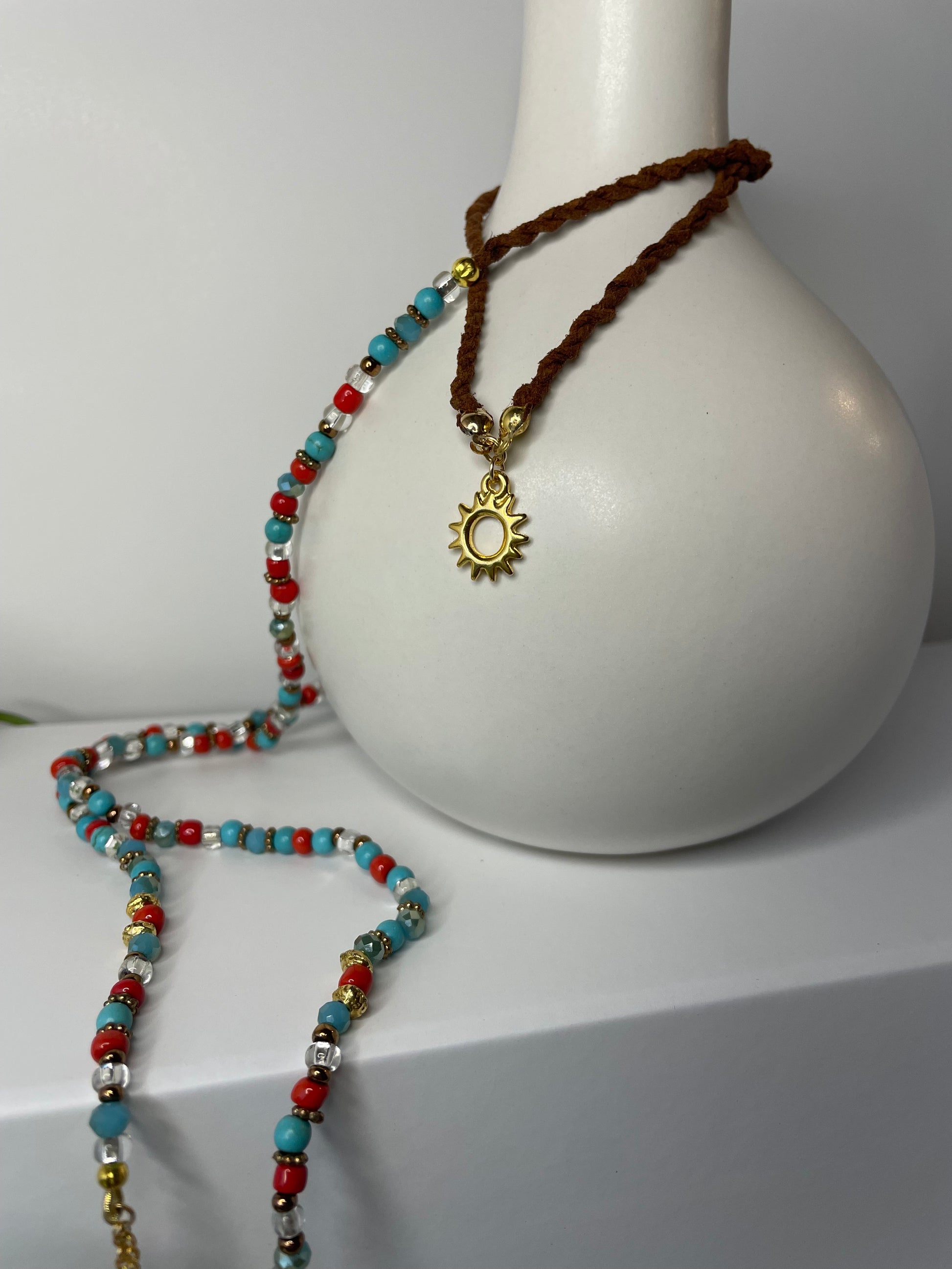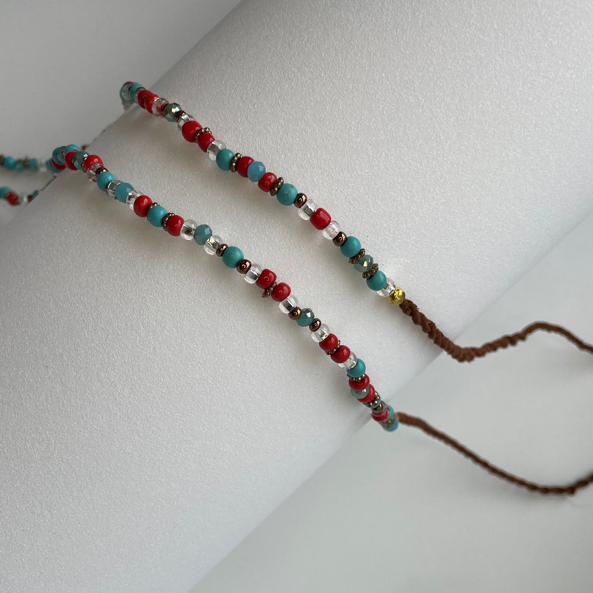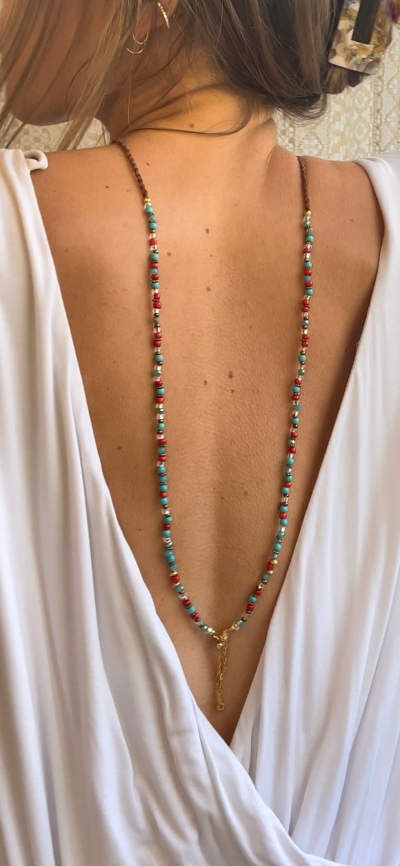 The gold loops are specifically designed to connect with each other so that the accessory chain can also be worn on your body. Wrap it around your neck, wrist, ankle, or torso and connect the ends by sliding the charm at the end of one gold loop through the other gold loop. Then slide the silver bead up to tighten/fasten together.