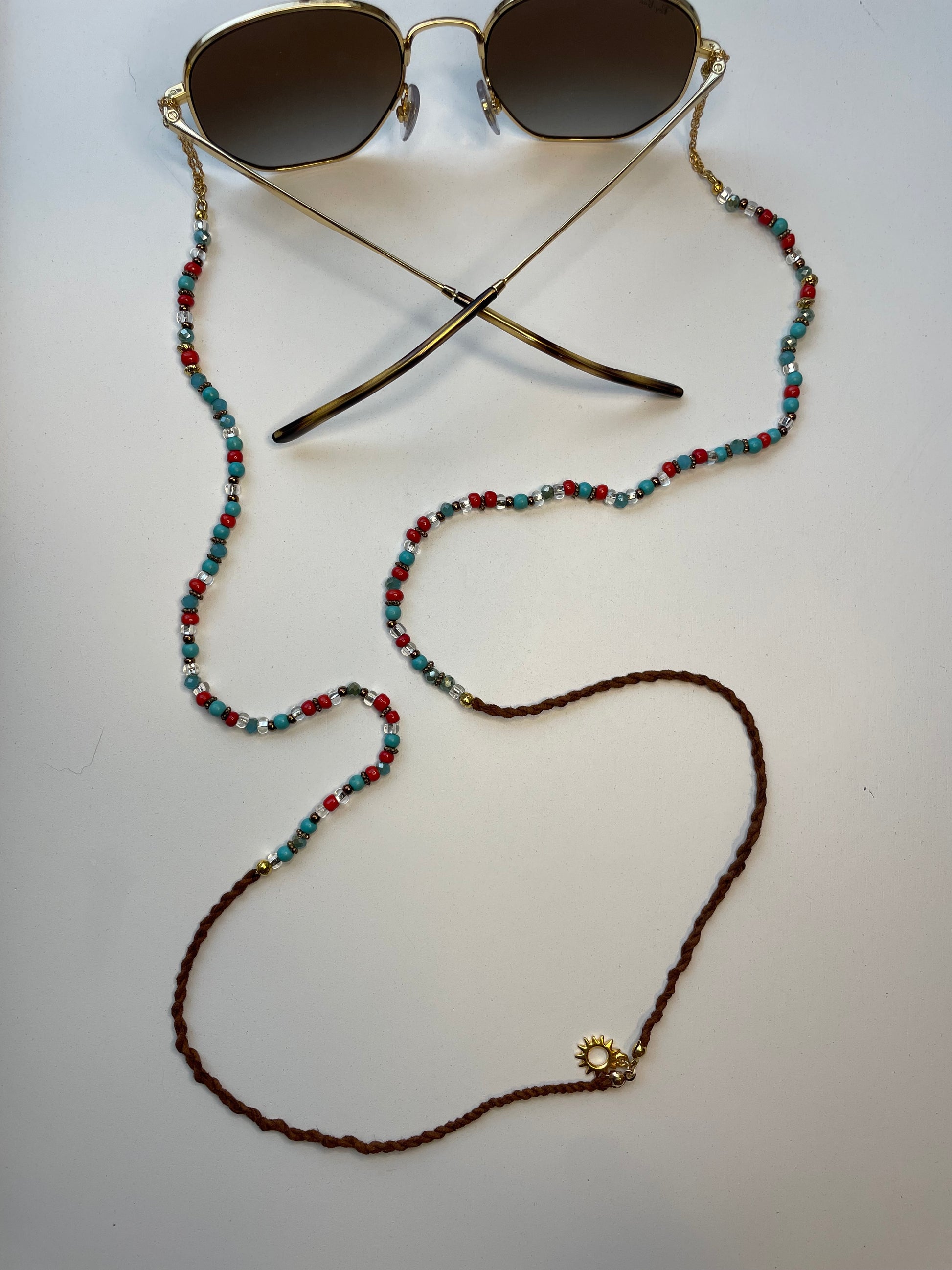 At each ends of the beaded chain are the uniquely designed adjustable gold loops. These are constructed to conveniently fit the particular size arms of your glasses, while giving your look a more polished and decorative feel. The adjustable loops are made with gold filled chain that is pulled through a sterling silver slider bead lined with silicone on the inside for a smooth glide.