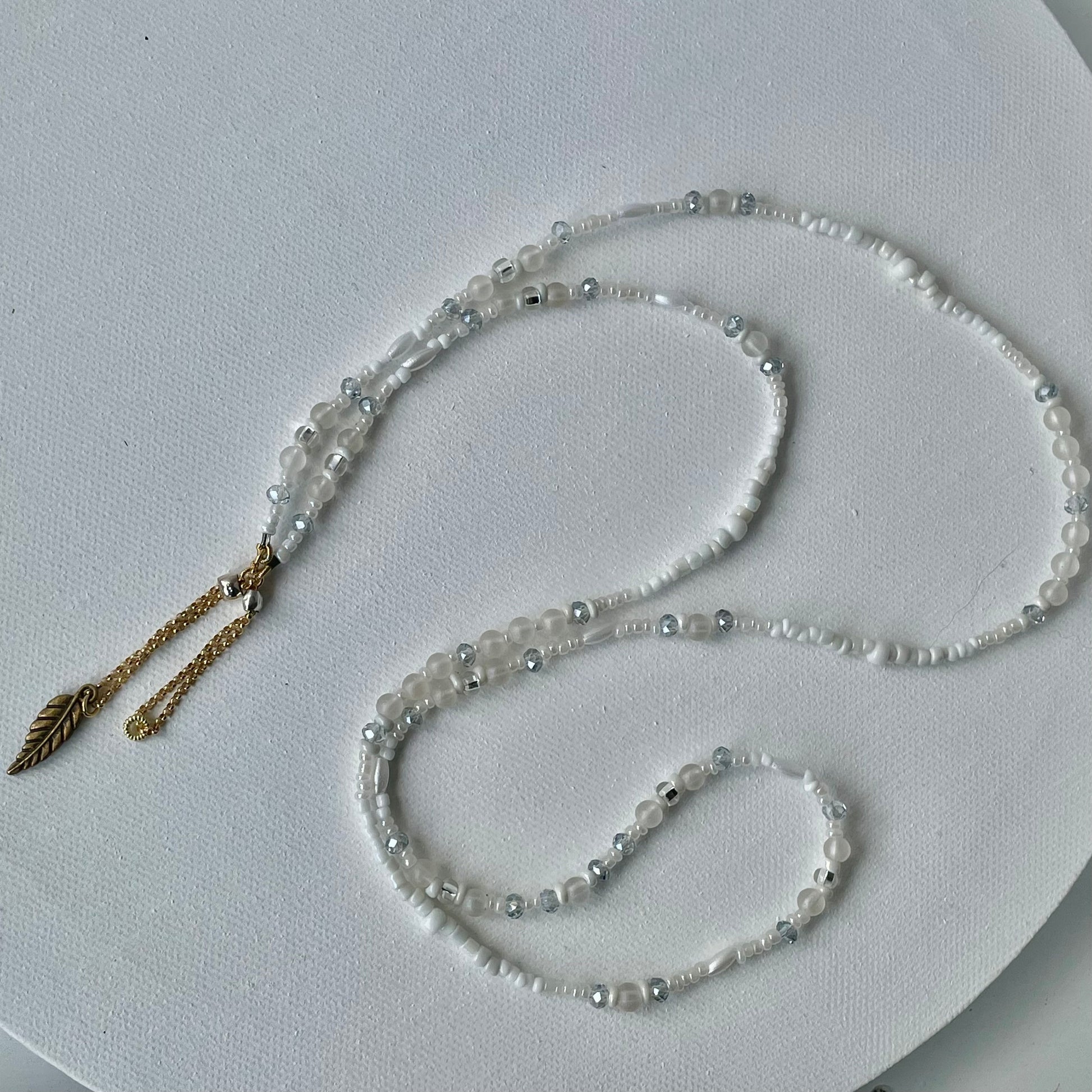 At each ends of the beaded chain are the uniquely designed adjustable gold loops. These are constructed to conveniently fit the particular size arms of your glasses, while giving your look a more polished and decorative feel. The adjustable loops are made with gold filled chain that is pulled through a sterling silver slider bead lined with silicone on the inside for a smooth glide.