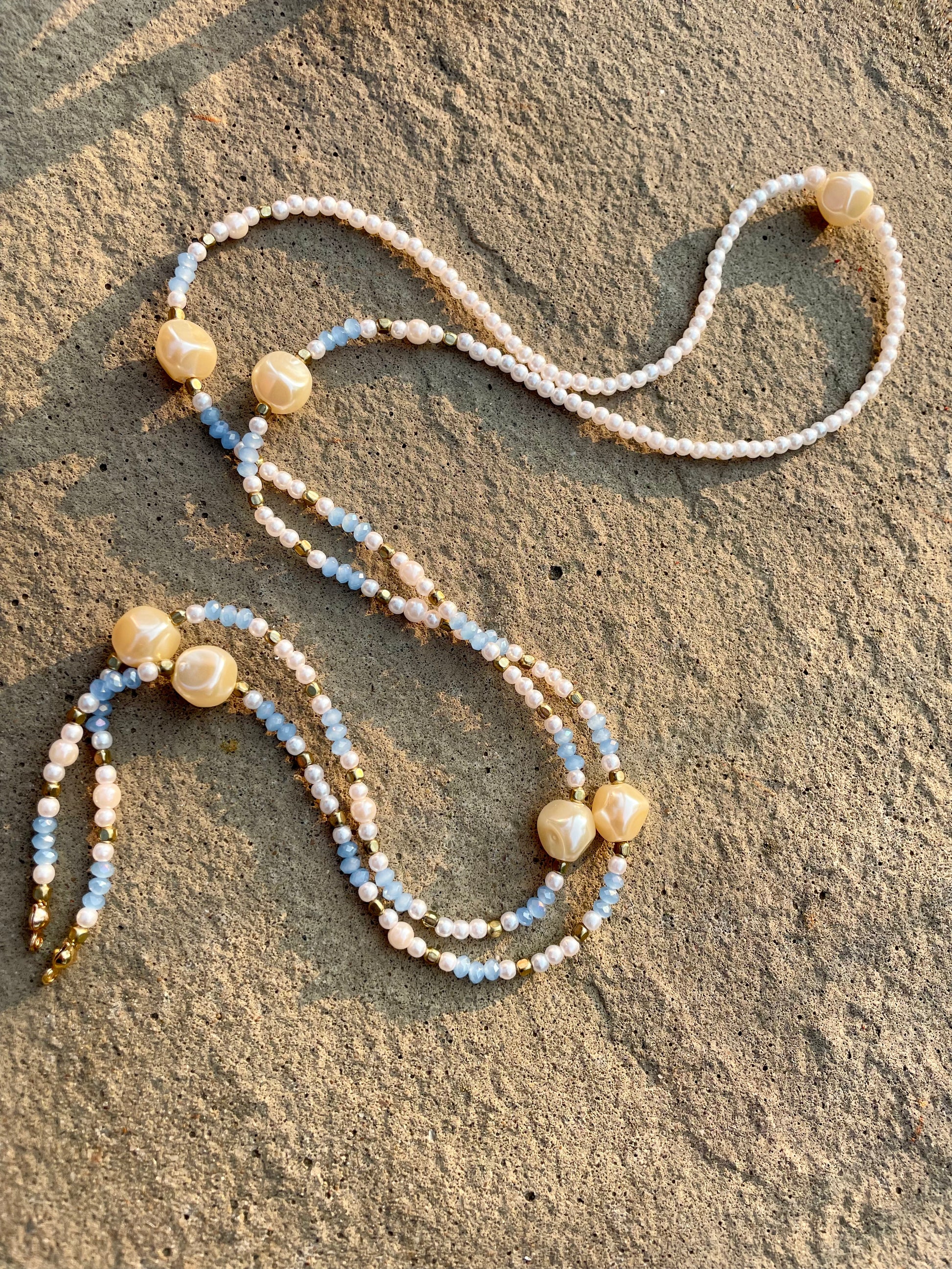 At each ends of the beaded chain are the uniquely designed adjustable gold loops. These are constructed to conveniently fit the particular size arms of your glasses, while giving your look a more polished and decorative feel. The adjustable loops are made with gold filled chain that is pulled through a gold plated slider bead lined with silicone on the inside for a smooth glide.