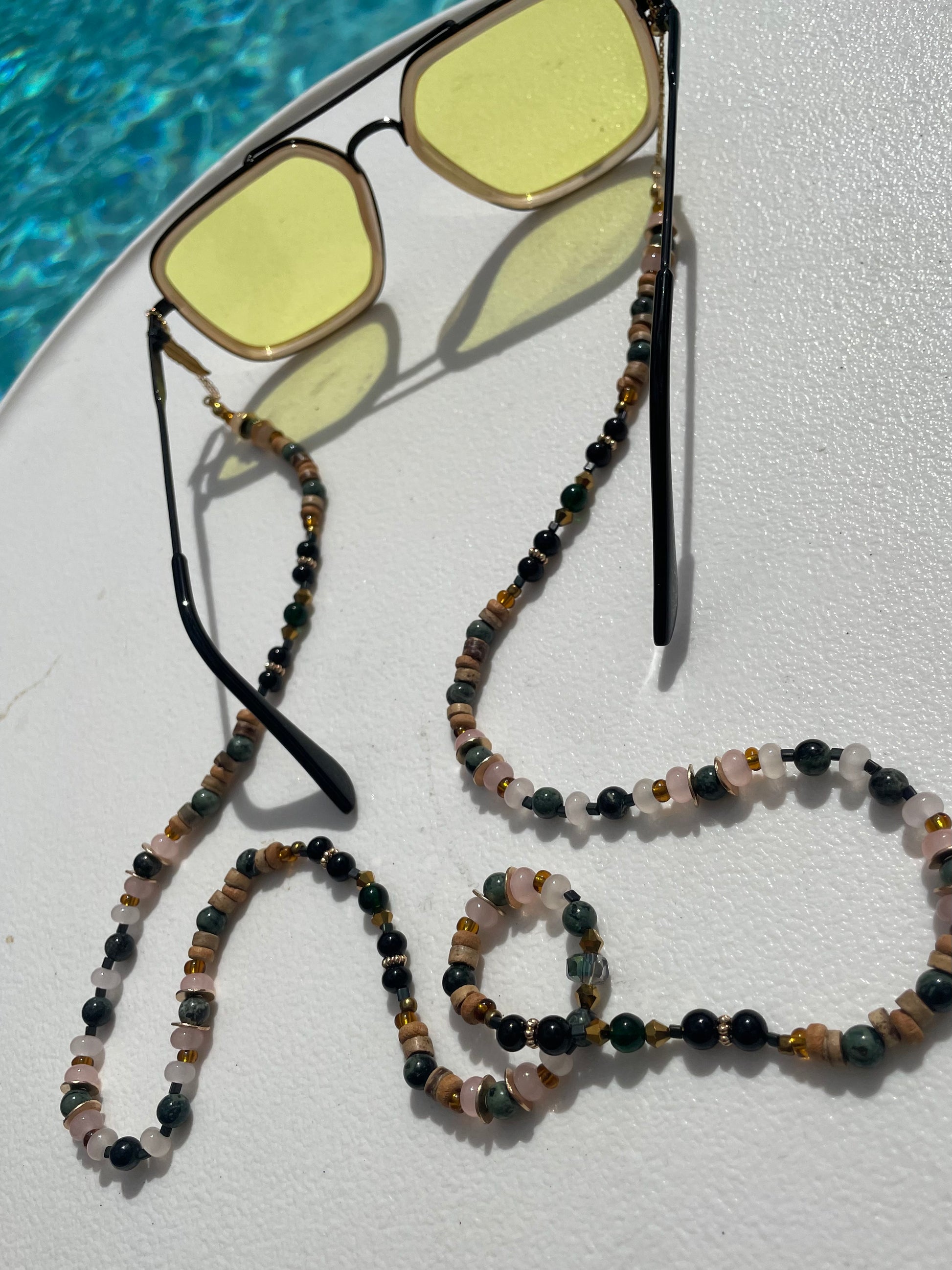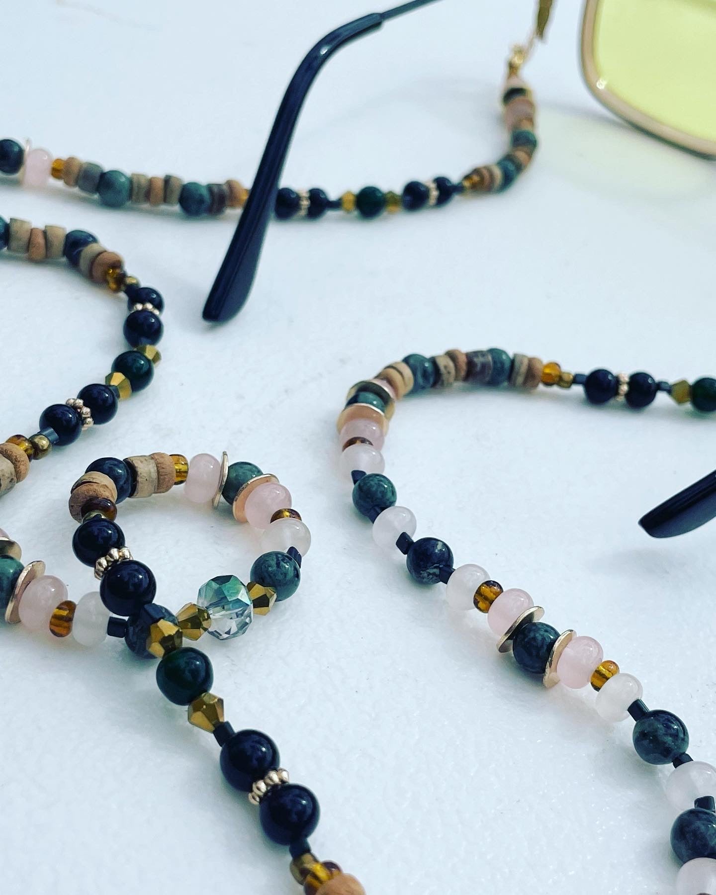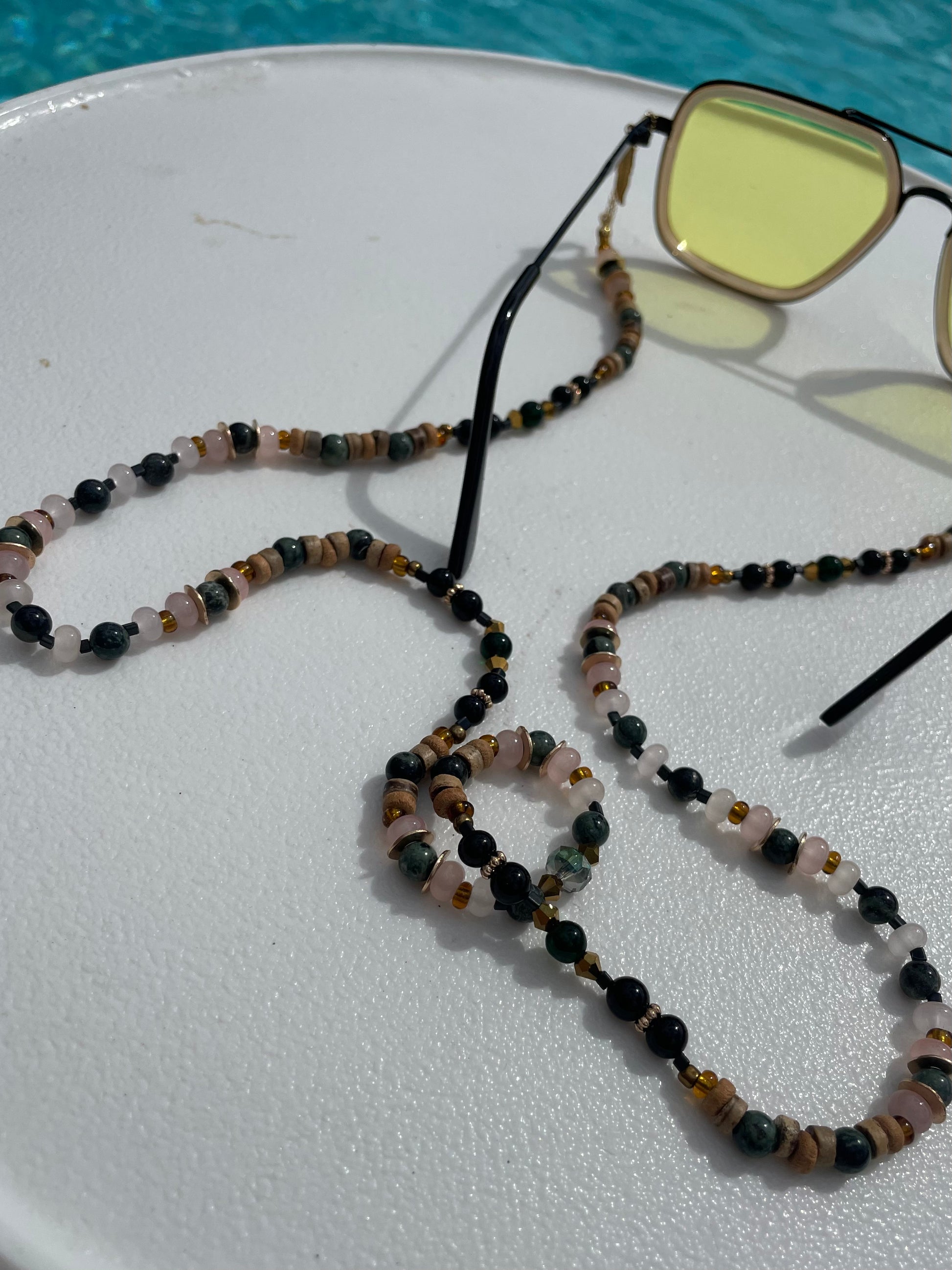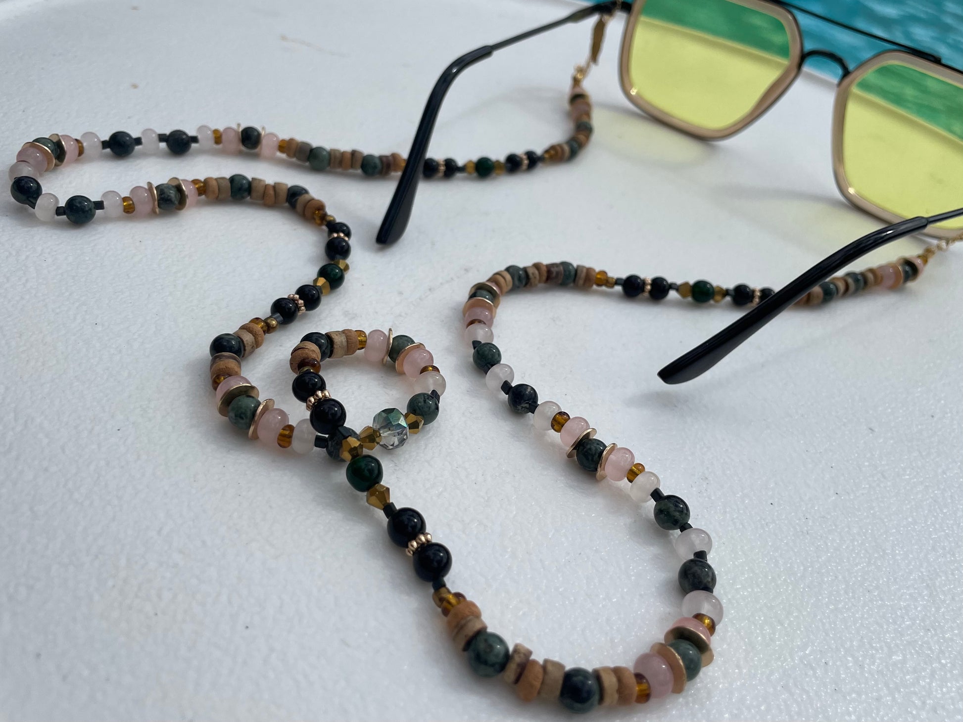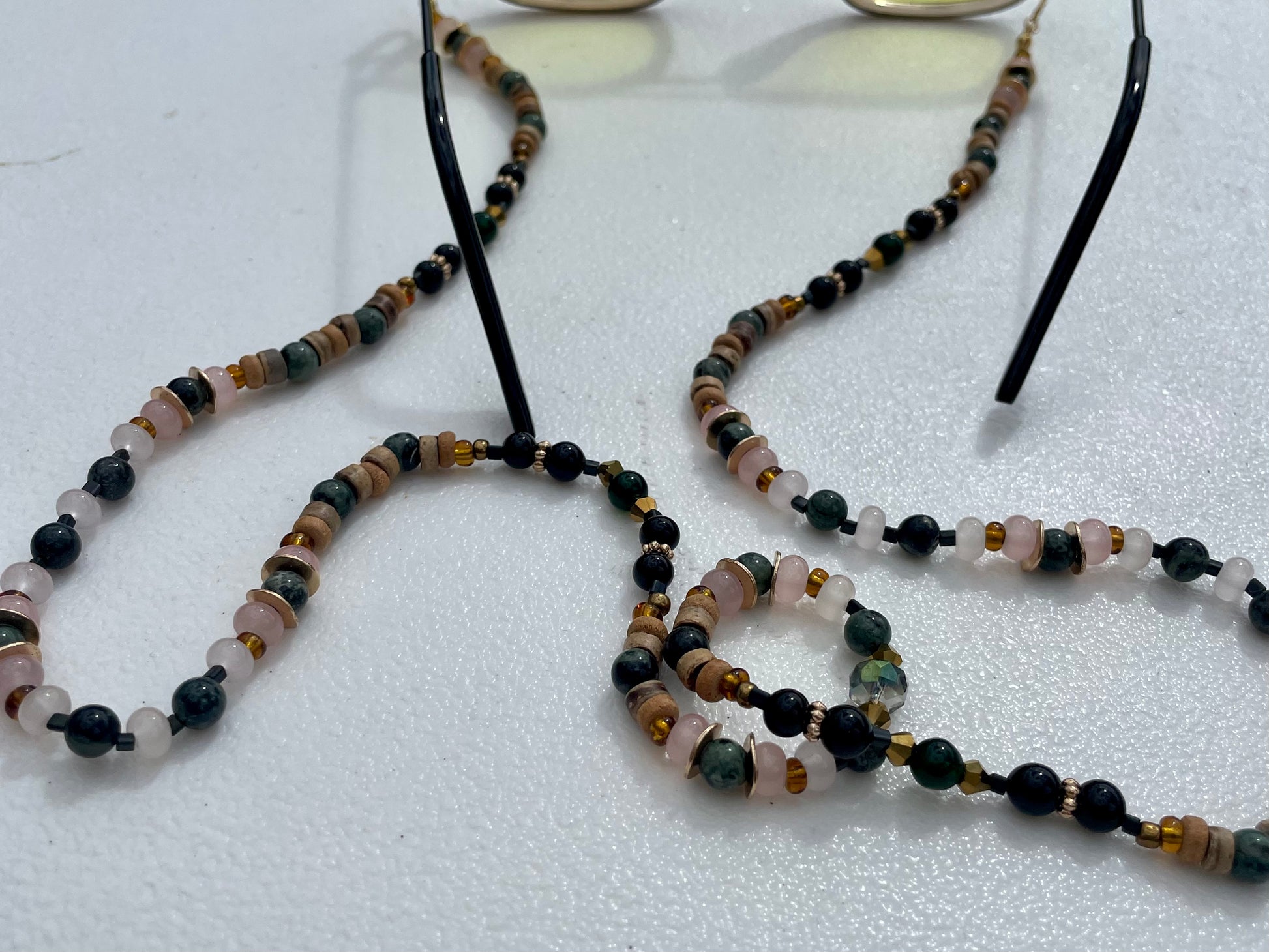 At each ends of the beaded chain are the uniquely designed adjustable gold loops. These are constructed to conveniently fit the particular size arms of your glasses, while giving your look a more polished and decorative feel. The adjustable loops are made with gold filled chain that is pulled through a gold plated slider bead lined with silicone on the inside for a smooth glide.