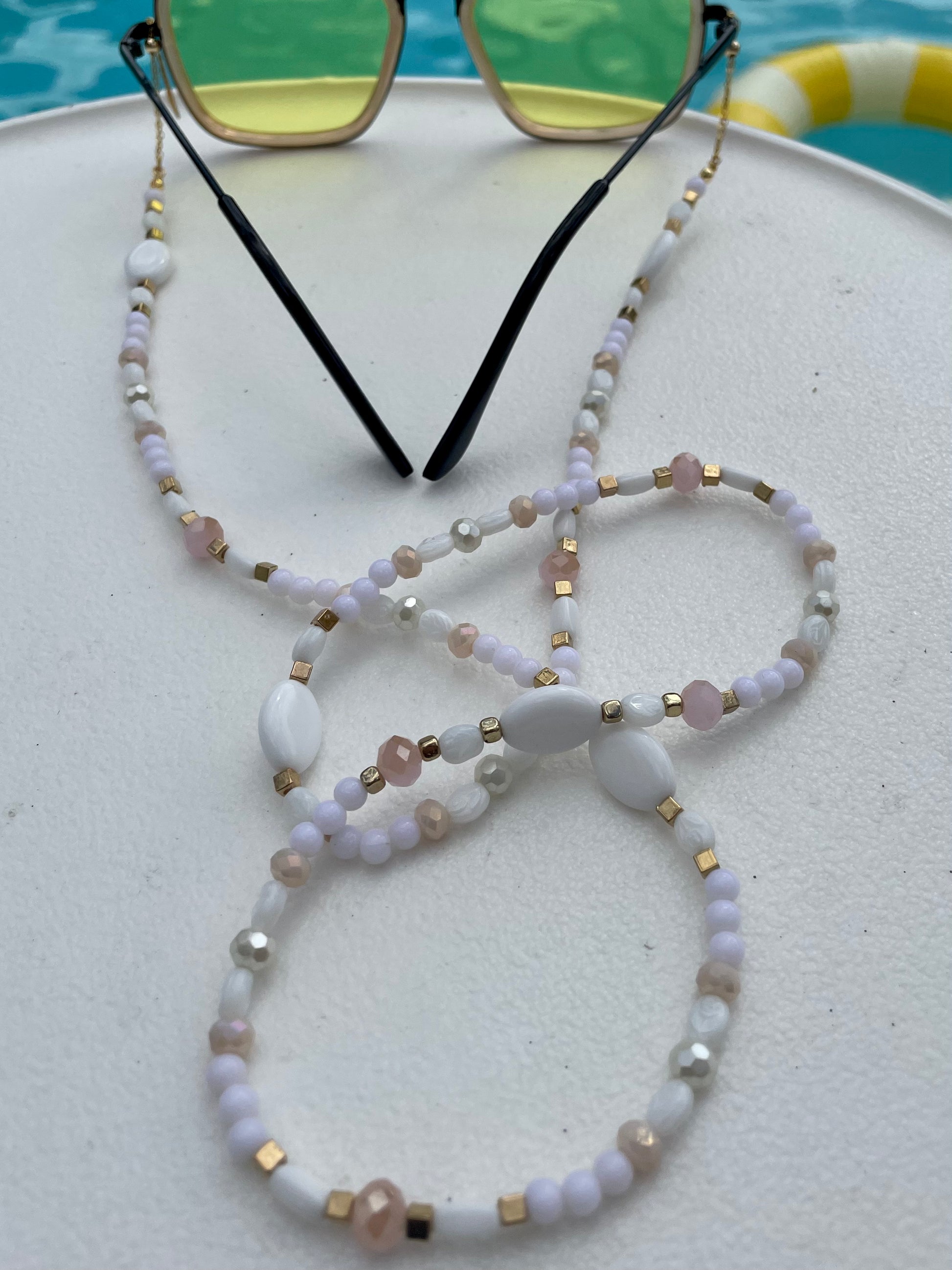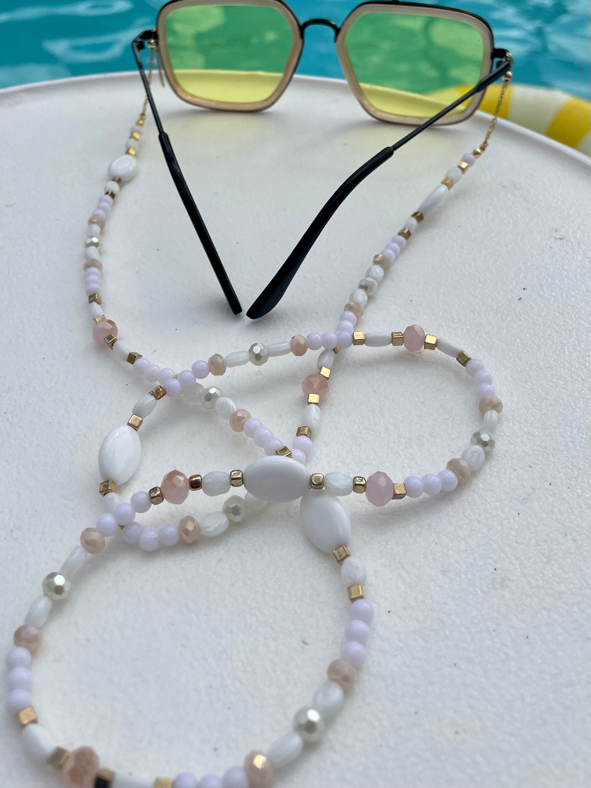 At each ends of the beaded chain are the uniquely designed adjustable gold loops. These are constructed to conveniently fit the particular size arms of your glasses, while giving your look a more polished and decorative feel. The adjustable loops are made with gold filled chain that is pulled through a gold plated slider bead lined with silicone on the inside for a smooth glide.